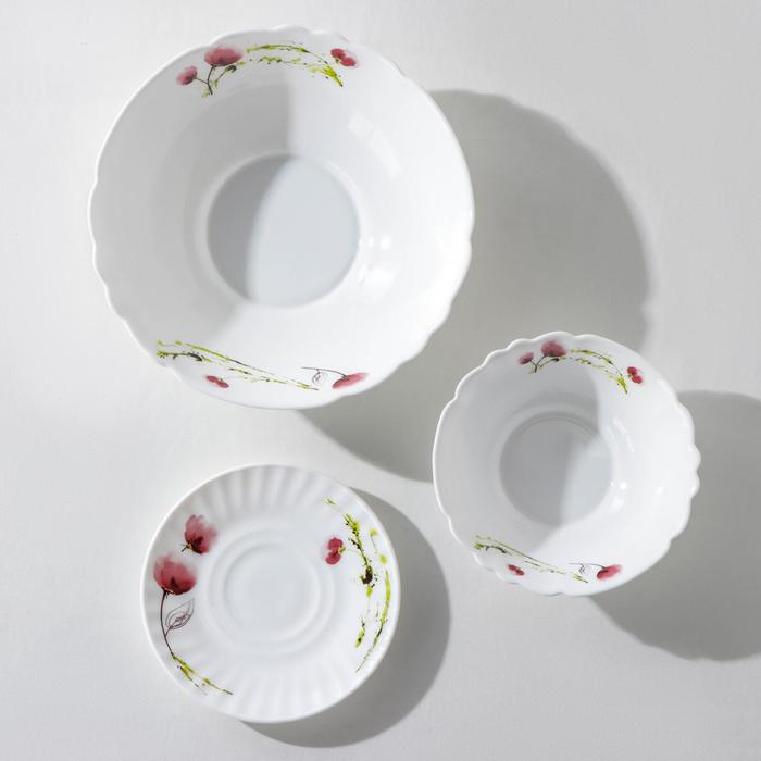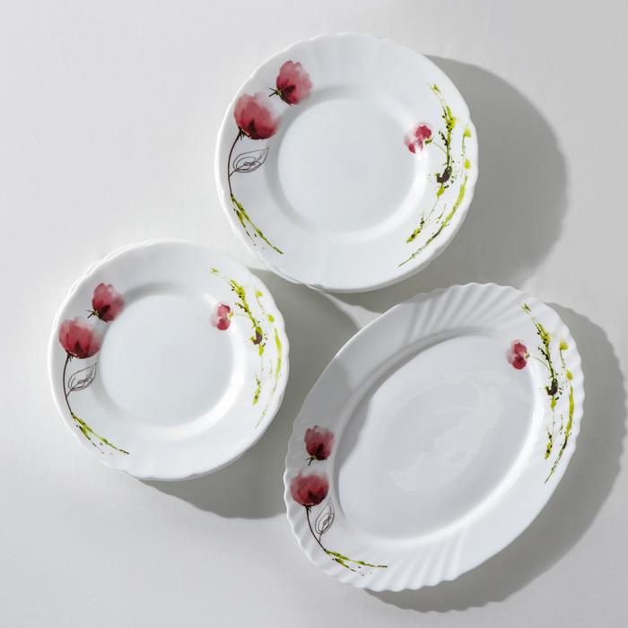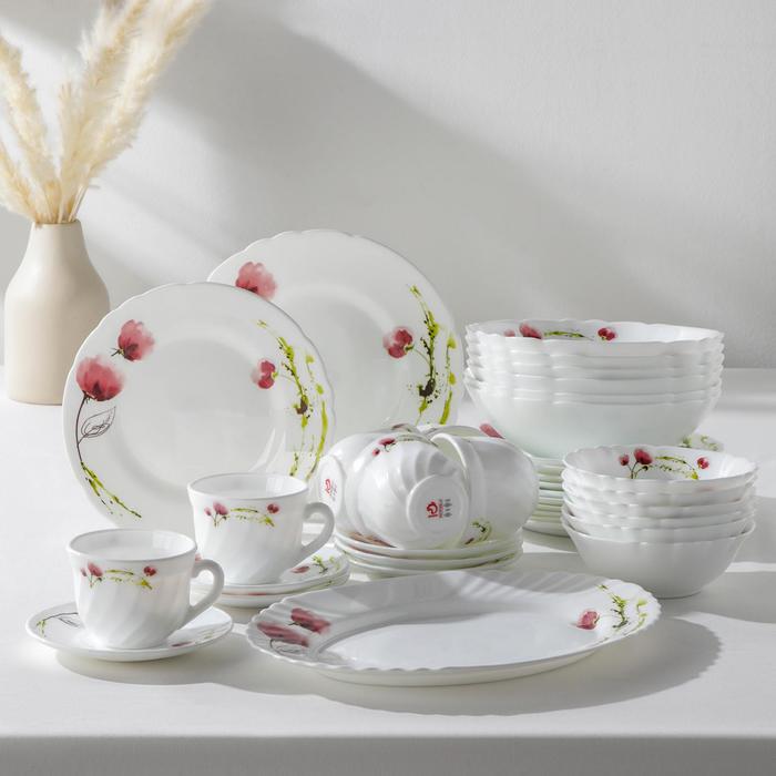 Чашка – 6 шт; блюдце – 6 шт; тарелка обеденная – 6 шт; миска суповая – 6 шт; тарелка десертная – 6 шт; салатник – 6 шт; блюдо овальное – 1 шт.