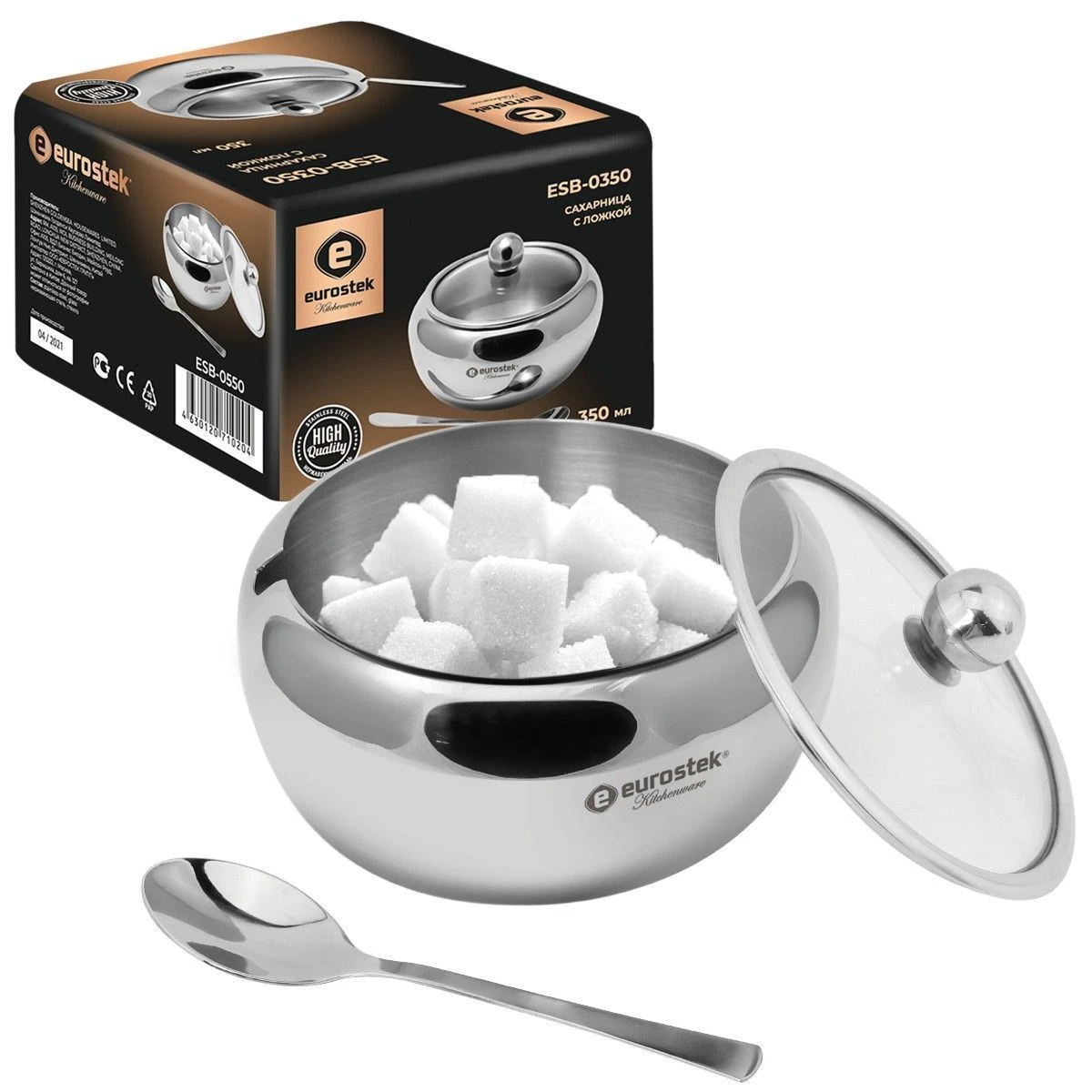 Сахарница Eurostek ESB-0350, 350мл 8x8.5см, нержавеющая сталь, глянцевая/матовая полировка, стеклянная крышка ,ложка из нержавеющей стали 14,2 см.