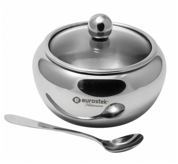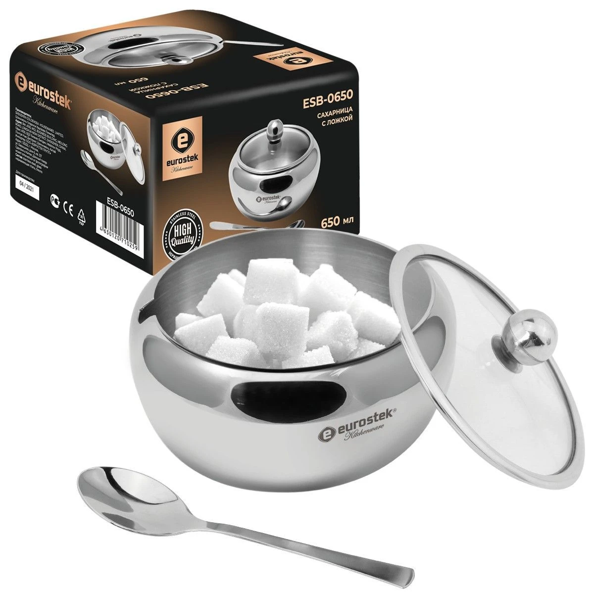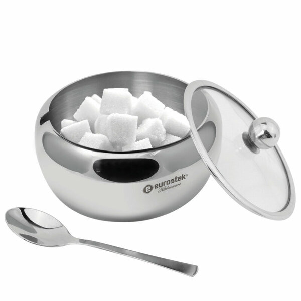 Стильная вместительная сахарница Eurostek ESB-0650 из нержавеющей стали объёмом 650 мл., идеально впишется в интерьер Вашей кухни или гостиной, качество изделия выше всяких похвал! Идеально для хранения сахарного песка. Крышка стеклянная только добавляет блеска и красоты изделию! В комплект входит стильная чайная ложечка.
