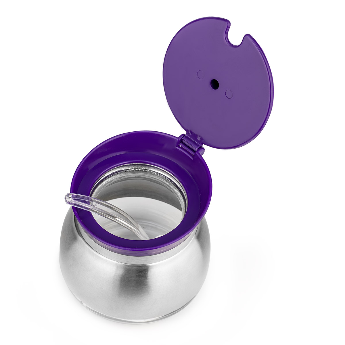 ачем хранить сахар в рваном пакете или заводской бумажной упаковке, если есть сахарница LARA с откидной крышкой и пластиковой ложечкой в комплекте? Благодаря практичному дизайну и необычной форме она станет заметным аксессуаром в оформлении вашего стола. Для производства были подобраны экологичные и безопасные материалы. Чаша выполнена из толстого прозрачного стекла с декоративной защитной накладкой из высококачественной нержавеющей стали с матовой отделкой. Крышка из пластика фиолетового цвета защитит содержимое от влаги, пыли и посторонних запахов. Легкий уход обеспечивает разборная конструкция, которую можно промыть под краном или воспользоваться посудомоечной машиной.
