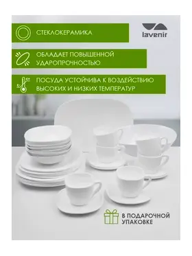 Комплектация Тарелка плоская обеденная 23 см диагональ - 6 шт; Тарелка плоская мелкая десертная 21 см диагональ - 6 шт; Салатник 16 см диагональ - 6 шт; Блюдо для подачи 30 см длина - 1 шт; Кружка для чая - 6 шт; Блюдце под чашку - 6 шт; Салатник 23 см диагональ - 1 шт; Подарочная упаковка - 1 шт
