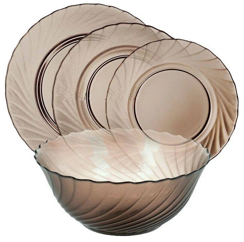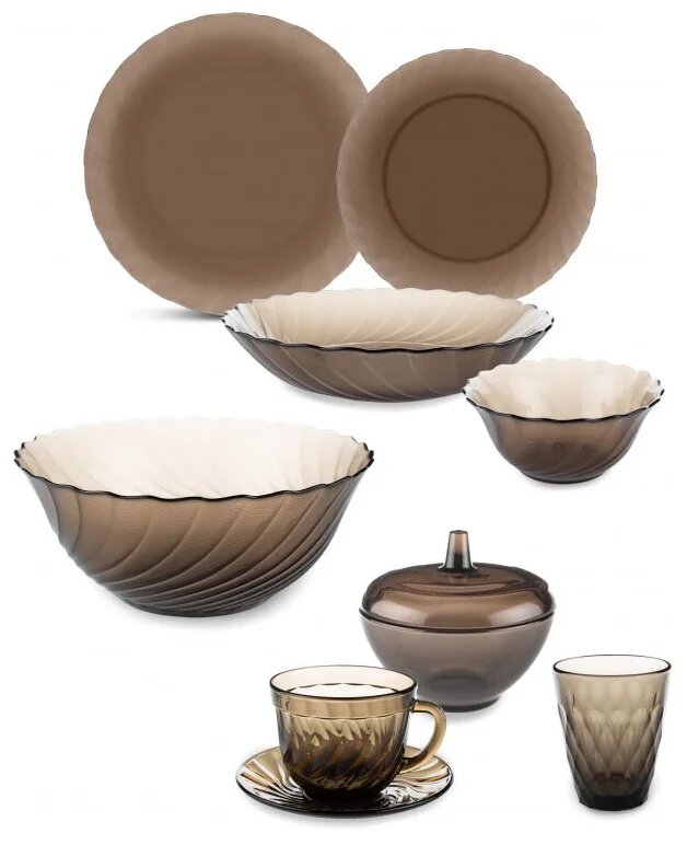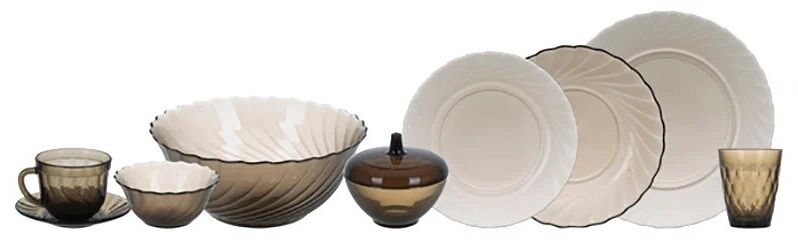 Комплектация:Тарелка десертная 19,5 см х 6. Тарелка обеденная 24,5 см х 1. Тарелка суповая 20,5 см х 6. Салатник малый 12 см 320 мл х 6. Салатник большой 24 см 2300 мл х 6. Стакан 160 мл х 6. Блюдце х 6. Чашка 220 мл х 6. Сахарница 11 см х 1. Крышка сахарницы х 1