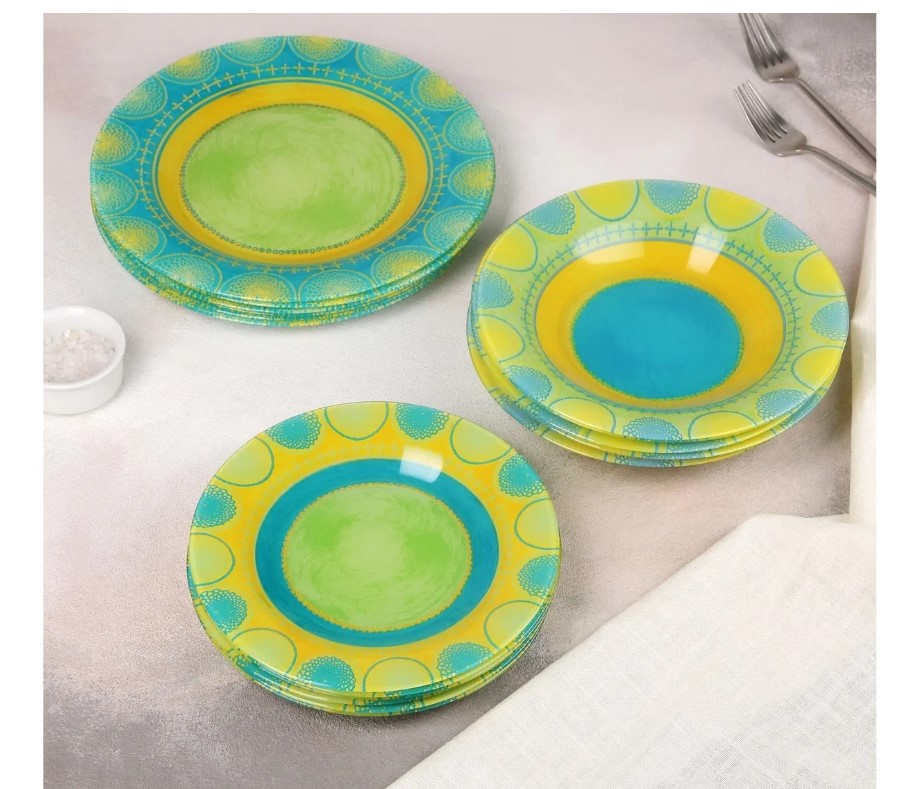 Столовый набор состоит из 6 обеденных тарелок 25см, 6 глубоких тарелок 21.5см и 6 десертных тарелок 19.5см. Материал: стекло. Страна: Франция.