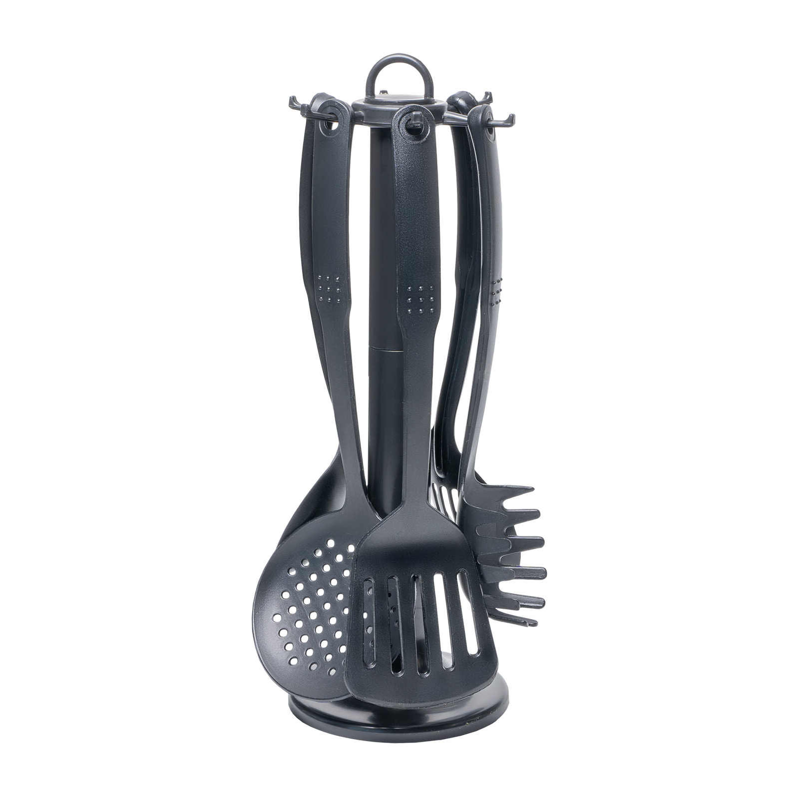 Принадлежности в наборе подвешены на специальную подставку, которую удобно ставить на стол или рабочую поверхность.Не нужно озадачиваться креплением. Набор включает 6 необходимых для приготовления и сервировки предметов: