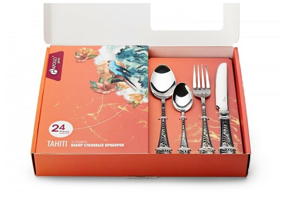 6 столовых вилок, 6 столовых ложек, 6 чайных ложек, 6 столовых ножей