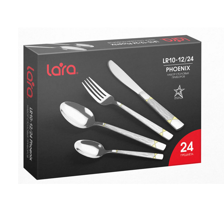 Дизайн столовых предметов Phoenix разрабатывался для торжественных случаев, чтобы украсить стол во время праздников. Лаконичная позолота, подарившая идею для названия набора (ФЕНИКС), обрамляет матовые узорчатые лепестки, нанесенные методом лазерной гравировки. Столовые приборы LARA изготовлены из стали с 18-процентным содержанием хрома и имеют зеркальную полировку класса «А». Особое внимание уделено остроте зубьев вилки. Труднодоступные места между зубьями, в которых могут скапливаться остатки пищи, отполированы вручную так, чтобы сделать поверхность ровной и гладкой и повысить гигиеничность изделий. Глубина столовой ложки не менее 7 мм, что обеспечивает оптимальную вместительность.