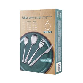 Столовые приборы LARA LR10-21/24 Кассиопея – это превосходный набор высокого качества, включающий 24 предмета на 6 персон. Каждый предмет идеально сбалансирован, ручки имеют специальную форму и отлично лежат в руке. Комплект изготовлен из пищевой нержавеющей стали, не имеет запаха и сохраняет вкус и аромат продуктов. Все изделия высокого качества и очень прочные, не гнутся, имеют длительный срок службы, отлично сохраняют эксплуатационные свойства. Столовые приборы Lara подходят как для ежедневного использования, так и для сервировки праздничного стола. Можно мыть в посудомоечной машине.