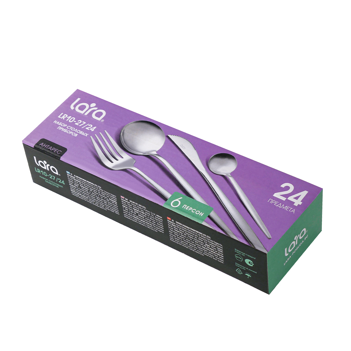 Столовые приборы LARA LR10-27/24 Антарес – это превосходный набор высокого качества, включающий 24 предмета на 6 персон. Данный набор сочетает в себе минималистичный дизайн с акцентом на четкие линии. Каждый предмет идеально сбалансирован, ручки имеют специальную форму и отлично лежат в руке. Комплект изготовлен из пищевой нержавеющей стали, не имеет запаха и сохраняет вкус и аромат продуктов. Все изделия высокого качества и очень прочные, не гнутся, имеют длительный срок службы, отлично сохраняют эксплуатационные свойства. Столовые приборы Lara подходят как для ежедневного использования, так и для сервировки праздничного стола. Можно мыть в посудомоечной машине.