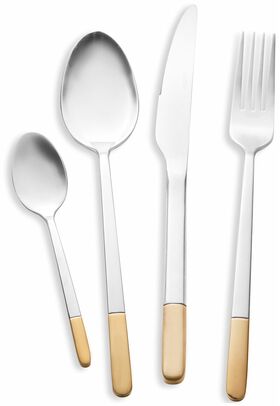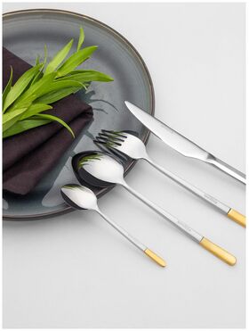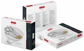 Набор столовых приборов 24 предмета Tesoro. Изготовлен из высококачественной нержавеющей стали. Зеркальная полировка сохранит блеск на долгое время, а уникальный дизайн с золотым напылением подойдёт для самого изысканного покупателя. Можно мыть в посудомоечной машине.