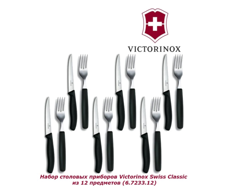 Набор столовых приборов Victorinox Swiss Classic из 12 предметов (6.7233.12.) Каждое изделие отличается лаконичным дизайном, высоким качеством изготовления. Вилками, ножами удобно пользоваться за счет эргономичных ручек скругленной формы, изготовленных из современного материала. Металлические части сделаны из высокопрочной стали, устойчивой к различным воздействиям. Вилки, ножи прекрасно сочетаются с сервизами, скатертями и другими кухонными аксессуарами. Набор подходит в качестве подарка молодой семье. Предметы сервировки стола легко моются вручную или в посудомоечной машине.