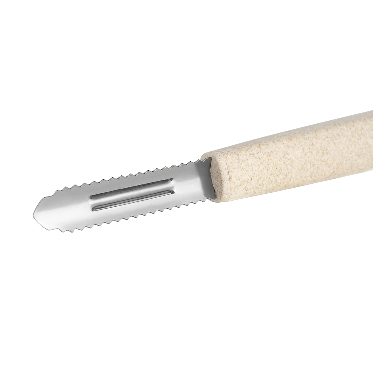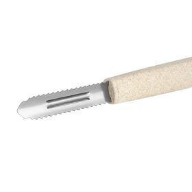 Овощечистка с вертикальным лезвием чаще используется для продолговатых продуктов (морковь, баклажан), а также для чистки картофеля. Обоюдозаточенное лезвие позволяет чистить продукт в обе стороны. Острый кончик овощечистки подходит для вырезания поврежденных участков, глазков. Волнистые зубья предназначены для чешуи. Имеется отверстие для подвешивания. Материал рукоятки овощечистки содержит рисовую шелуху. Приобретая данное изделие, вы вносите вклад в снижение потребления пластика.