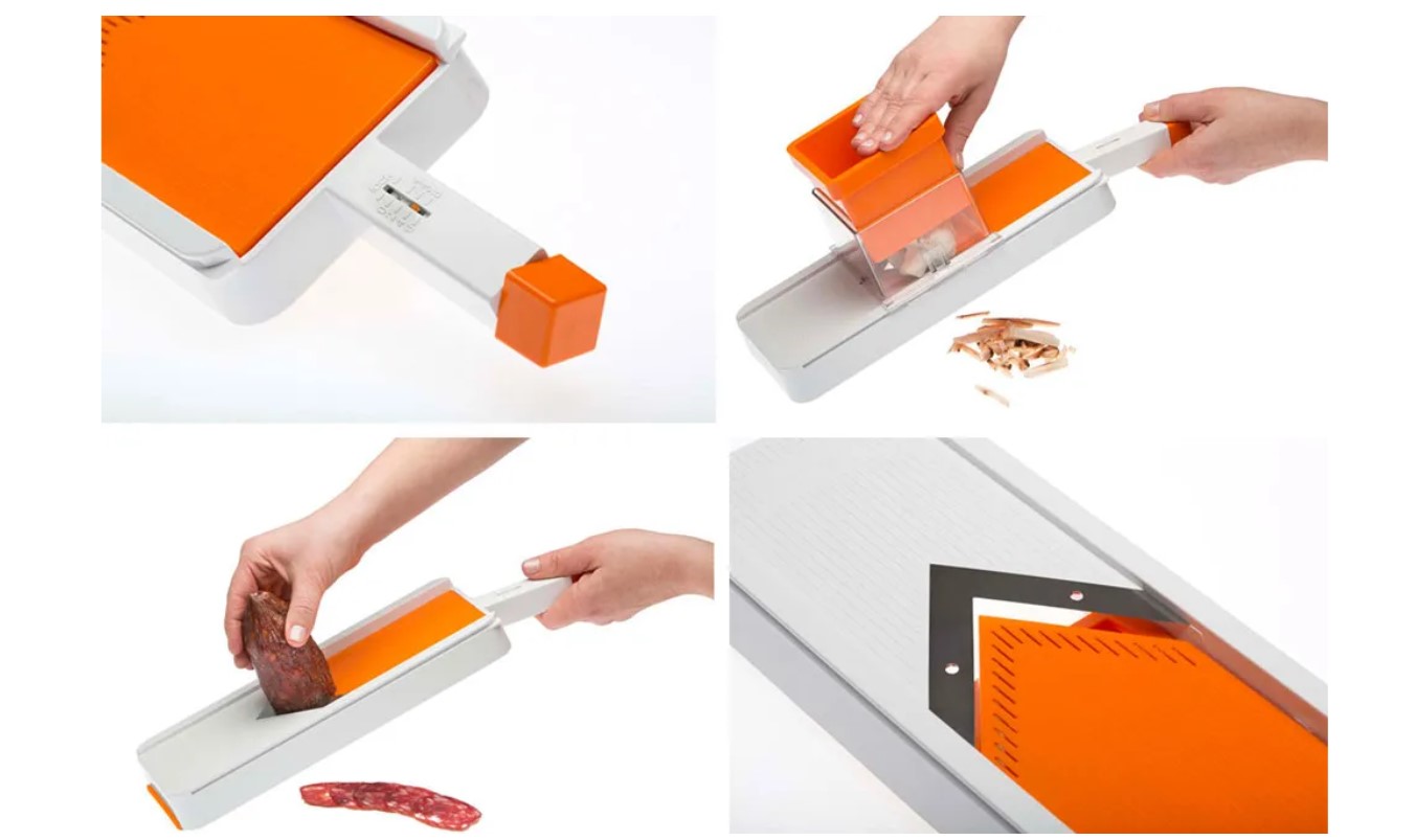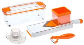 Овощерезка Status 115610 в комплекте с контейнером, плододержателем и ножом для чистки овощей и фруктов. Подходит для нарезки овощей, фруктов, сыра, мясных продуктов (например, колбасы), а также хлеба. Острое V-образное лезвие облегчает нарезку. Лазерная заточка гарантирует долгий срок службы. Имеет регулировку толщины среза от 0 до 6 мм. Возможность нарезки сразу в контейнер. Удобный плододержатель для мелких и крупных плодов. Может нарезать кольцами или соломкой (легкое переключение).