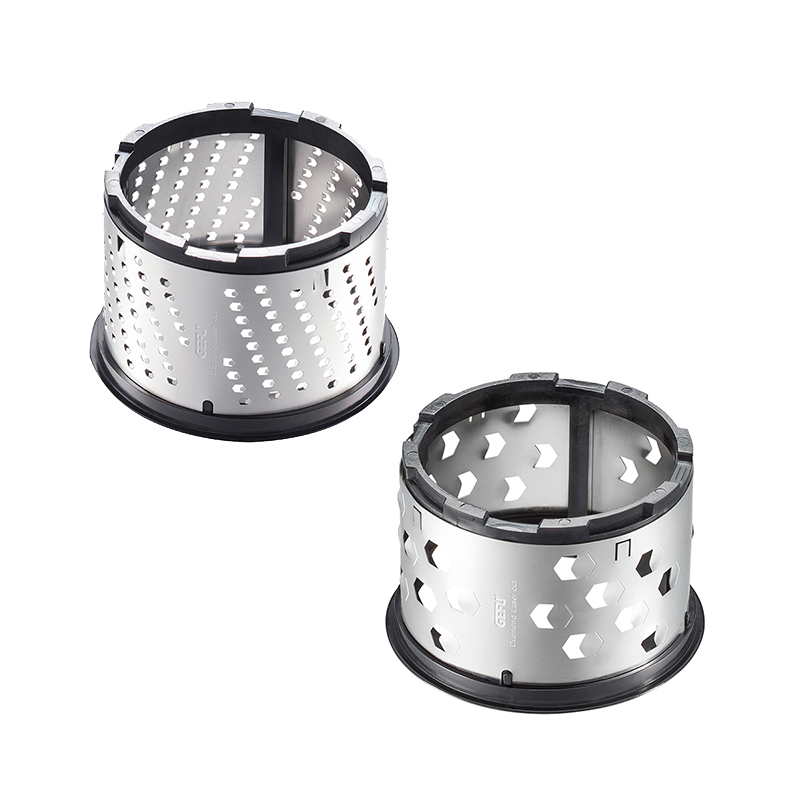 В комплекте 2 барабана-терки, контейнер с крышкой.