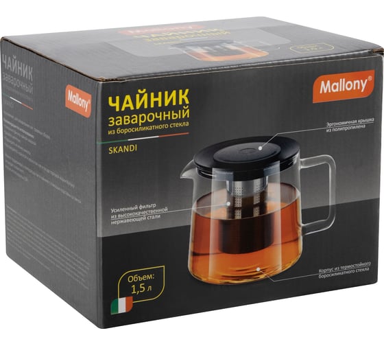Заварочный чайник Mallony Skandi, объем 1.5 л, из боросиликатного стекла, с прямоугольной ручкой 910126 предназначен для использования в офисе или дома.