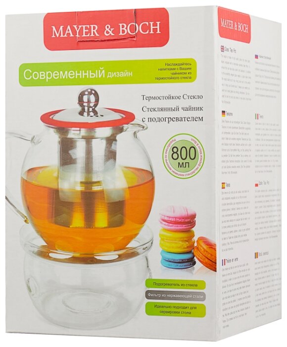 Заварочный чайник MAYER&BOCH изготовлен из термостойкого боросиликатного стекла, крышка и фильтр выполнены из нержавеющей стали. Чайник оснащен стеклянной подставкой для подогрева, рассчитанной на одну греющую свечу. Изделия из стекла не впитывают запахи, благодаря чему Вы всегда получите натуральный, насыщенный вкус и аромат напитков. Заварочный чайник из стекла удобно использовать для повседневного заваривания чая практически любого сорта, но цветочные, фруктовые, красные и желтые сорта чая лучше других раскрывают свой вкус и аромат при заваривании именно в стеклянных чайниках, а также сохраняют все полезные ферменты и витамины, содержащиеся в чайных листах. Стальной фильтр гарантирует прозрачность и чистоту напитка от чайных листьев, при этом сохранив букет и насыщенность чая. Прозрачные стенки чайника дают возможность насладиться насыщенным цветом заваренного чая. Изящный заварочный чайник MAYER&BOCH будет прекрасно смотреться в любом интерьере. Не подходит для использования в микроволновой печи. Подходит для мытья в посудомоечной машине.