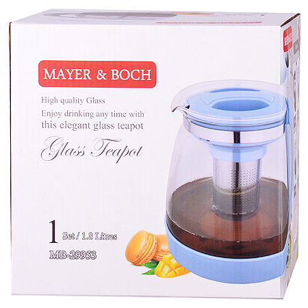 Заварочный чайник MAYER&BOCH изготовлен из термостойкого стекла, фильтр выполнены из нержавеющей стали. Изделия из стекла не впитывают запахи, благодаря чему вы всегда получите натуральный, насыщенный вкус и аромат напитков. Заварочный чайник из стекла удобно использовать для повседневного заваривания чая практически любого сорта. Но цветочные, фруктовые, красные и желтые сорта чая лучше других раскрывают свой вкус и аромат при заваривании именно в стеклянных чайниках, а также сохраняют все полезные ферменты и витамины, содержащиеся в чайных листах. Стальной фильтр гарантирует прозрачность и чистоту напитка от чайных листьев, при этом сохранив букет и насыщенность чая. Прозрачные стенки чайника дают возможность насладиться насыщенным цветом заваренного чая. Изящный заварочный чайник MAYER&BOCH будет прекрасно смотреться в любом интерьере.