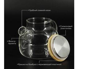 Отлично впишется в кухню любого дизайна и стиля. Чайник выполнен из жаропрочного слекла, что позволяет использовать его на электрических и газовых плитах. Носик-антикапля позволяет разлить напиток без проливания. Бамбуковая крышка с силиконовым уплотнительным кольцом не упадет при наливании напитка в чашку. Фильтр-пружина выполнен из высококачественной нержавеющей стали, что сделает чаепитие безопасным и защитит напиток от попадания в него чаинок. В чайнике можно заваривать как листовые чаи, так и фруктовые. Наш заварочный чайник Pomi d'Oro станет прекрасным украшением стола и создаст атмосферу комфорта и уюта.