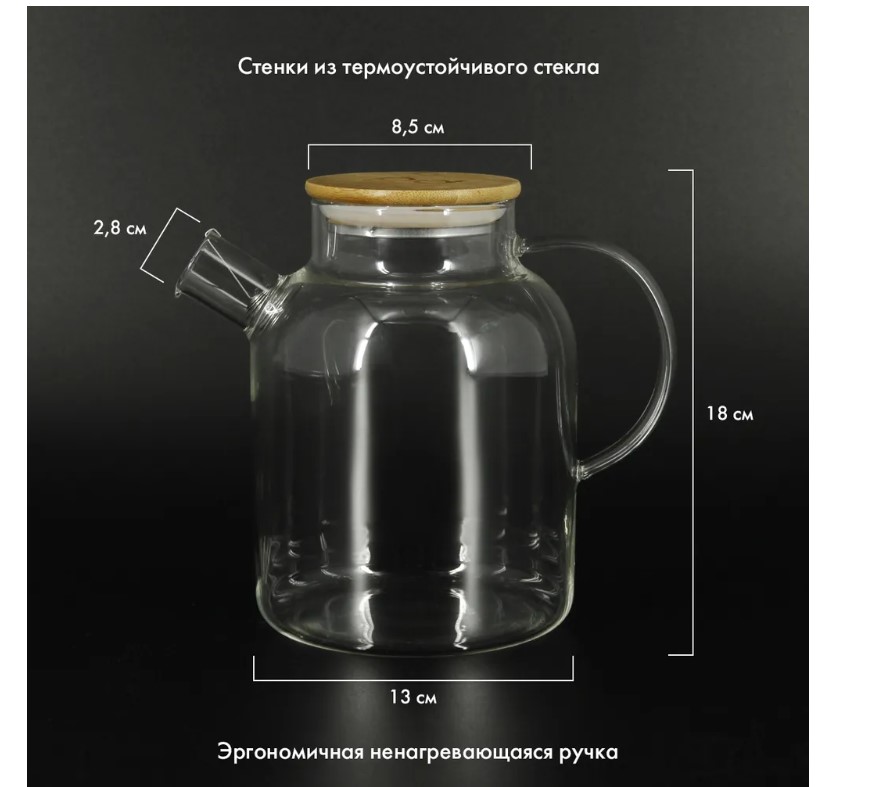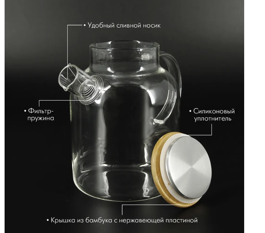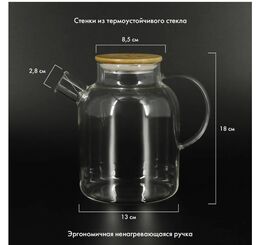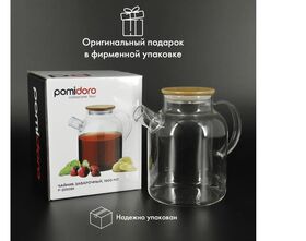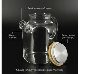 P250089 Neri Чайник заварочный стеклянный с фильтром-пружиной и бамбуковой крышкой имеет вместительный объем 1800мл. Чайник из стекла с фильтром подходит для заваривания чая, трав, горячих и холодных фруктовых напитков. Чайник бочонок выполнен из жаропрочного стекла, устойчив к перепадам температуры. Бамбуковая крышка с силиконовым уплотнительным кольцом не упадет при наливании напитка в чашку. Дно крышки выполнено из нержавеющей стали, что позволяет долго удерживать тепло внутри колбы. Заварник для чая не впитывает запахи и сохраняет неизменным вкус и аромат напитка. Ручка жаропрочного прозрачного чайника не нагревается. Чайник с фильтром имеет стальное ситечко, которое будет удерживать заварку при разливании чая по чашкам. Также ситечко-пружинка очень удобна в использовании и мытье. Такой чайник бочонок можно мыть в посудомоечной машине. Чайник заварочный стеклянный - отличный выбор как для каждодневного использования, так и для сервировки праздничного стола. Стеклянный чайник с фильтром объемом 1800 мл идеален для большой дружной компании или семейных чаепитий. Чайник стеклянный в красивой фирменной коробке станет прекрасным подарком вашим друзьям и близким.