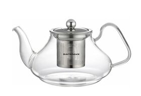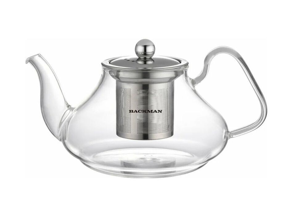 BACKMAN BM-0308 Чайник заварочный, 1000 мл, корпус из термостойкого боросиликатного стекла. Возможность использования на плите. Съемный фильтр и крышка из нержавеющей стали, не нагревающаяся ручка из стекла, подарочная упаковка.