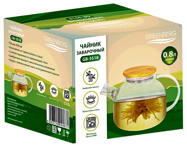 Заварочный чайник Greenberg имеет объем 800 мл. Небольшой объем, которого хватит на небольшую семью или компанию. Дизайн чайника отлично впишется в любой интерьер.