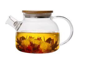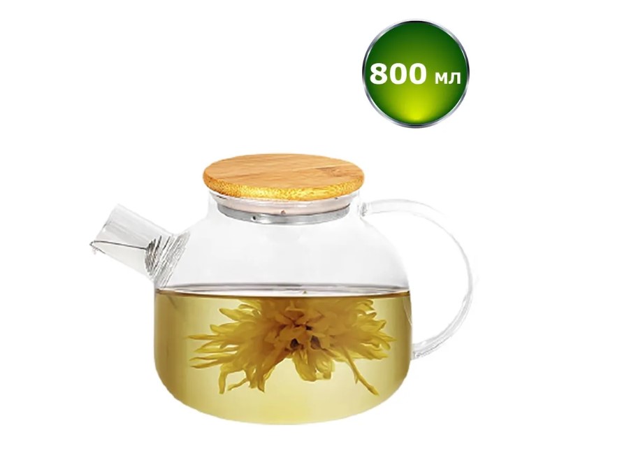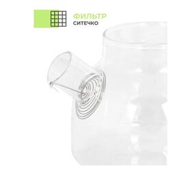 Чайник выполнен из безопасного и прочного материала - стекла. Чайник оснащен фильтром-ситечком для крупных и мелких чаинок.Благодаря широкому горлу воду удобно наливать и мыть чайник.