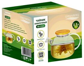 Чайник заварочный 1100 мл Изготовлен из термостойкого стекла Ситечко-пружинка из нержавеющей стали Бамбуковая крышка с металлическим основанием Корпус чайника можно мыть в посудомоечной машине