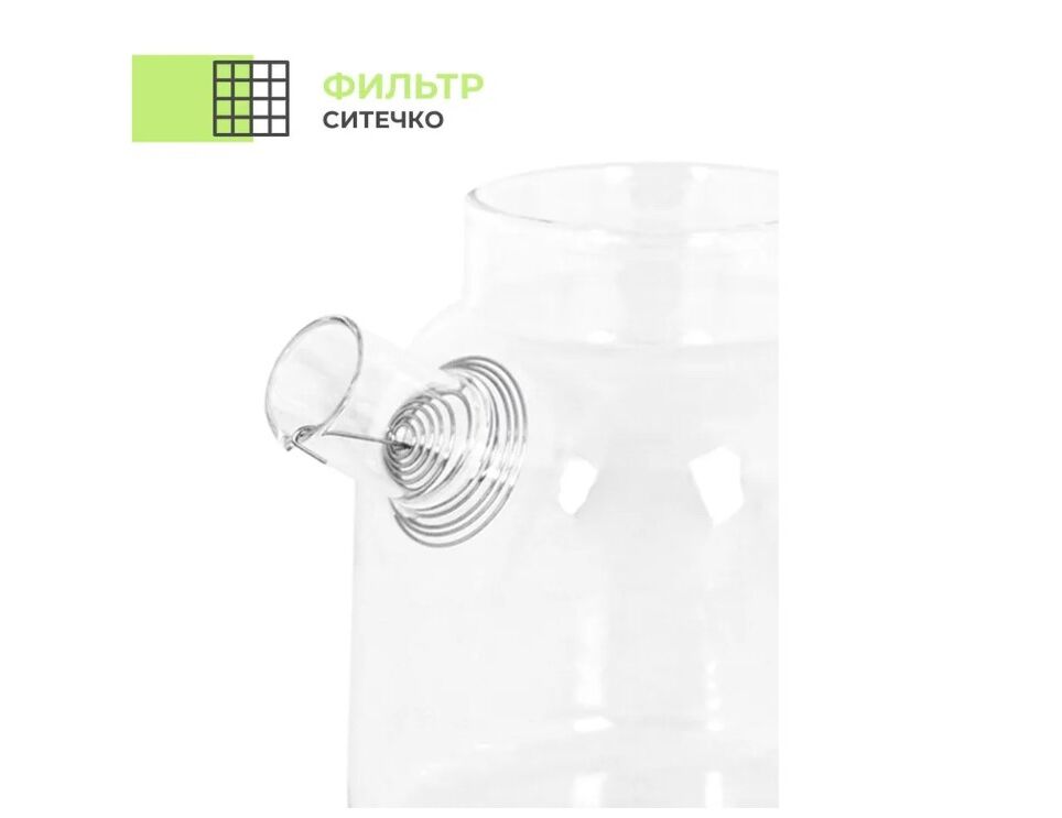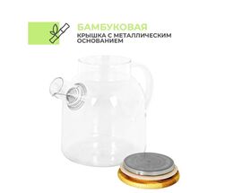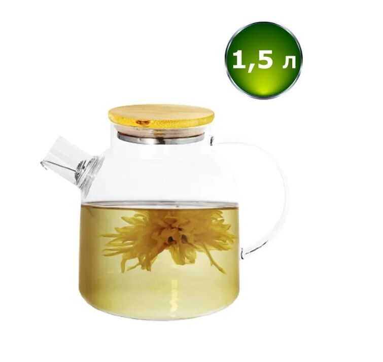 Чайник заварочный 1500 мл Изготовлен из термостойкого стекла Ситечко-пружинка из нержавеющей стали Бамбуковая крышка с металлическим основанием Корпус чайника можно мыть в посудомоечной машине