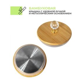 Крышка изготовлена из бамбука и оснащена удобной ручкой и металлическим основанием, что позволяет увеличить срок службы крышки.