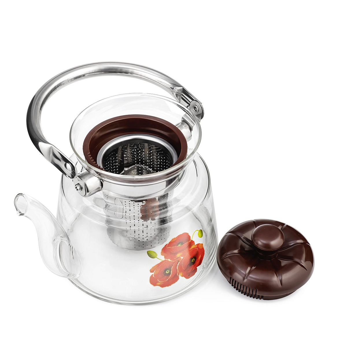 Отличный заварочный чайник LARA подойдёт для большой семьи, где любят и ценят чай. С его помощью вы сможете приготовить 5-6 порций ароматного напитка любых сортов и разновидностей. Рисунок на колбе в виде цветка дополняет образ, что позволяет чайнику вписаться в любой интерьер. При изготовлении были выбраны экологически чистые и безопасные материалы. Высококачественное жаропрочное стекло подходит для электрических и газовых плит, вы можете смело ставить чайник на открытый огонь. Ручка из нержавейки и жароупорная бакелитовая крышка не нагреваются. Жёсткий фильтр для заваривания из нержавеющей стали легко снимается для мытья и очистки.