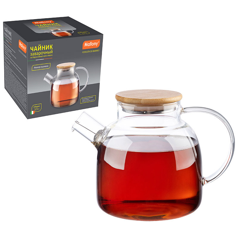 Заварочный чайник Mallony Foresta di bambu, объем 1.5 л, из боросиликатного стекла с крышкой из бамбука 910123 предназначен для использования в офисе или дома.
