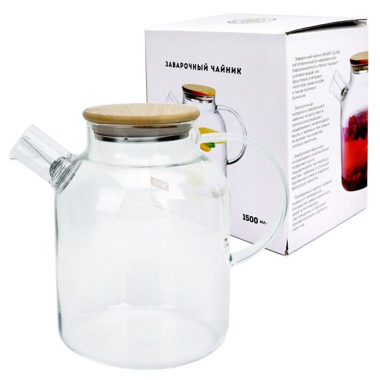 Заваривание чая – тонкое искусство, которое помогает человеку соединиться с природой, достичь гармонии и духовного просветления. Стеклянный заварочный чайник объемом 1500 мл станет для вас проводником в мир чайных церемоний и поможет расслабиться после напряженного рабочего дня. Благодаря стеклянным стенкам вы сможете наблюдать за медитативным завариванием чая и внутренне настраиваться на приятный вечер. Чайник позволит вам раскрыть все оттенки вкуса полезных травяных чаев, фруктовых и ягодных напитков. Бамбуковая крышка с силиконовым уплотнителем будет поддерживать температуру внутри чайника на протяжении нескольких часов, а стальное ситечко поможет отфильтровать ваш напиток. Заварочный чайник изготовлен из безопасного жаропрочного стекла, которое не впитывает запахи и не влияет на вкус готового напитка. За счет прочного стекла чайник также выдерживает колебания температур от -20 до +100 градусов и мытье в посудомоечной машине. Строгий чайник элегантно дополнит кухонный сервиз, поможет вам получить эстетичес