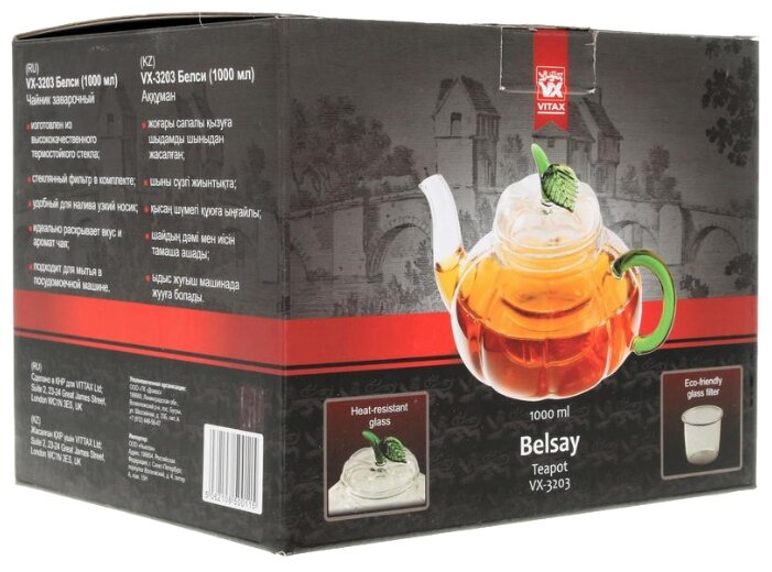 Заварочный чайник, изготовленный из высококачественного термостойкого стекла, имеет стеклянный фильтр, удобный для налива узкий носик, идеально раскрывает вкус и аромат чая. Подходит для мытья в посудомоечной машине Vitax.