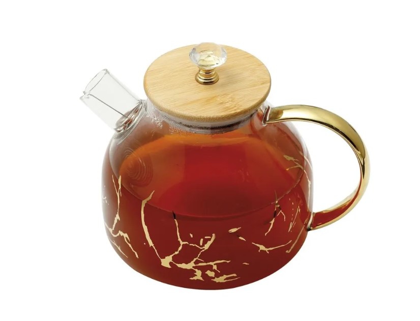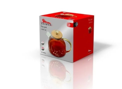 Чайник заварочный ZEIDAN , корпус из термостойкого боросиликатного стекла с декором "под золото", ручка на корпусе с декоративным покрытием "под золото", крышка - бамбук с декоративной ручкой "кристалл". Возможность использования на плите, съемный фильтр-пружина из высококачественной нержавеющей стали, подарочная упаковка.