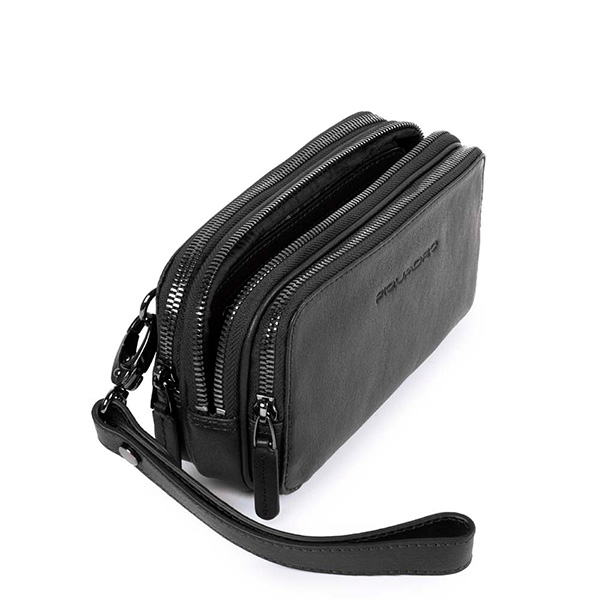 Клатч из коллекции Piquadro Black Square. Изготовлена из высококачественной структурной телячьей кожи с черным кантом. Имеет три отделения с кармашками для 12 банковских карт, съемный плечевой ремень и хлястик на запястье. Очень полезный аксессуар на каждый день