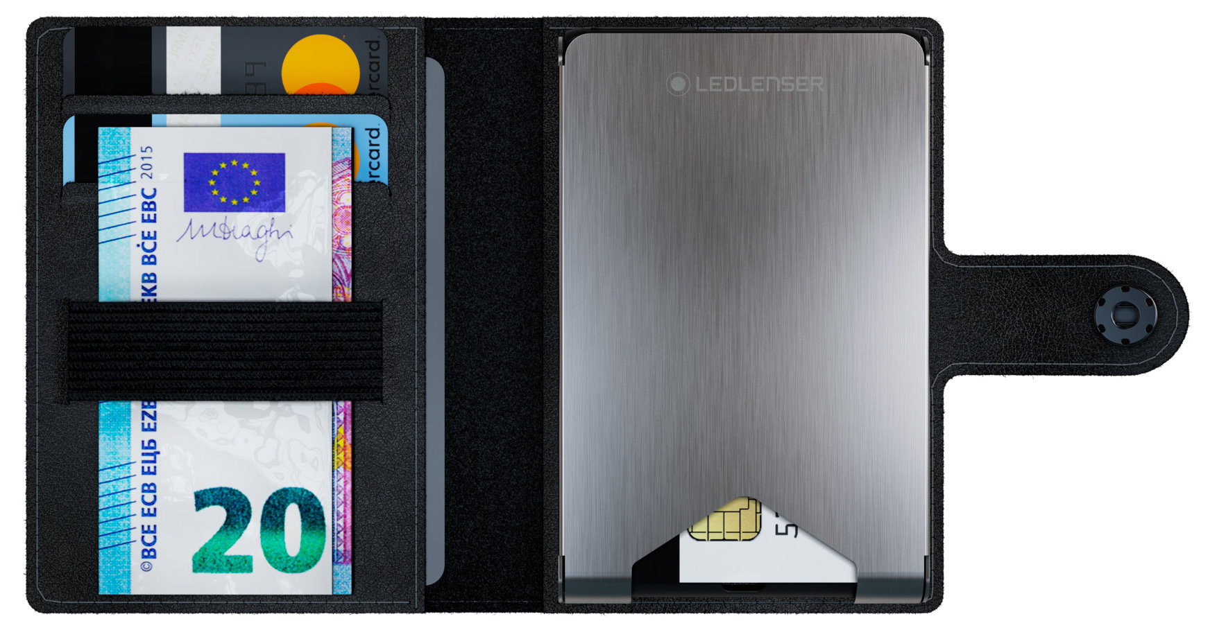 LED Lenser Lite Wallet – инновационный и функциональный аксессуар для повседневного использования. Это кошелек из натуральной кожи с RFID-защитой и фонариком, который светит в разы ярче штатного фонаря смартфона. Внутри него предусмотрено несколько отделений для банковских карт и резинка для хранения бумажных купюр. Встроенный фонарь может освещать пространство вокруг световым потоком в 150 Лм, либо работать в экономичном режиме целых 12 часов. Питается устройство от аккумулятора, для зарядки которого можно использовать комплектный кабель USB Type-C или беспроводную зарядку.