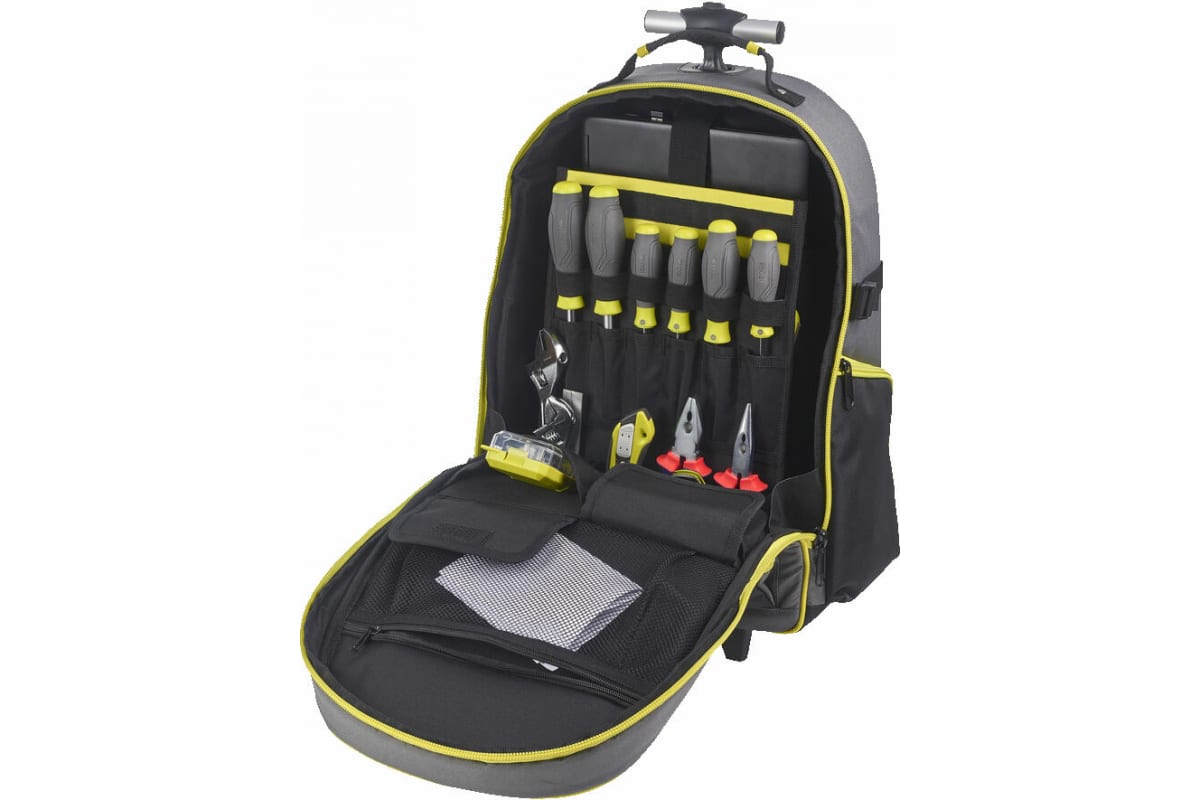Рюкзак с колесиками имеет большое внутреннее пространство, которое вмещает много инструментов, а благодаря карманам и различным отсекам все аксессуары и ваши личные вещи всегда будут в порядке. Изготовлен из прочного материала 600 Ден, который отличается высокой прочностью и надёжностью.