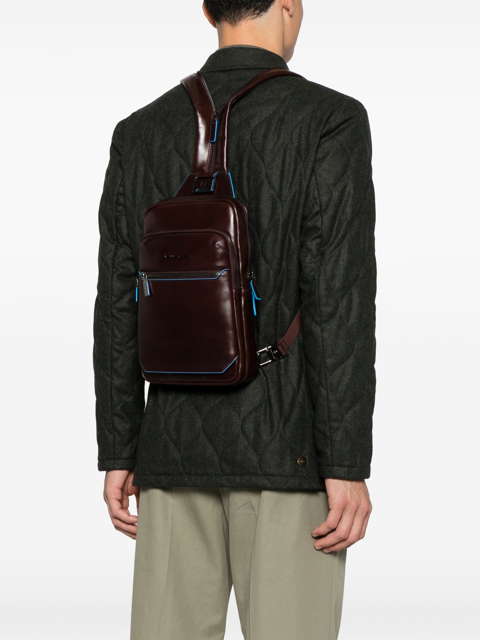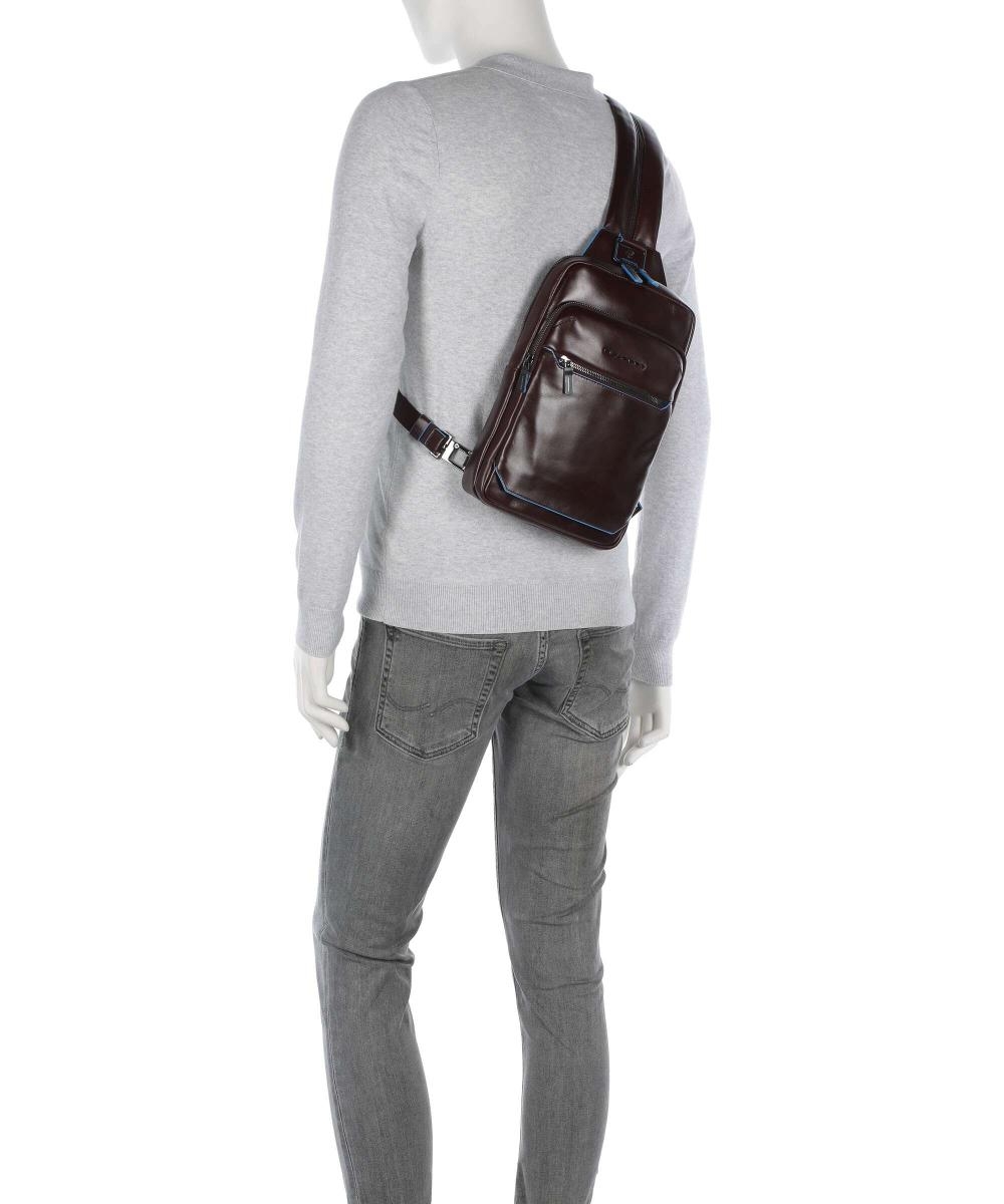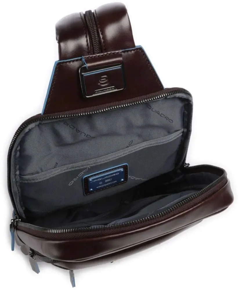 Стильный кожаный рюкзак с одной лямкой из флагманской коллекции Piquadro Blue Square. Изготовлен из высококачественной гладкой телячьей кожи с фирменной голубой окантовкой. Рюкзак имеет два отделения, одно из которых с отсеком для планшета IPAD®AIR-IPAD PRO 9.7/IPAD 11", другое с кармашками для телефона и ручек. На передней и задней части также расположены карманы на молнии. Молния на лямке, петли на задней части рюкзака и карабин, позволяют максимально вариативно и удобно носить данный рюкзак. Удобная и практичная модель, отлично подойдет для ежедневного использования в качестве альтернативы сумкам через плечо.
