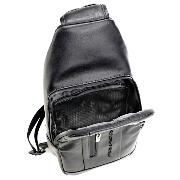 Стильный кожаный рюкзак с одной лямкой из новой коллекции Piquadro Urban. Изготовлен из гладкой телячьей кожи с использованием черненой фурнитуры. Рюкзак имеет одно отделение с кармашками для телефона и письменных принадлежностей. На передней части расположен карман на молнии и крепление для наушников. Рюкзаки с одной лямкой это популярный тренд последних лет, многие используют их в качестве альтернативы небольших сумок через плечо. Данная модель рюкзака выпускается в 4 расцветках, от классической черной до выделяющейся серой с яркими молниями.