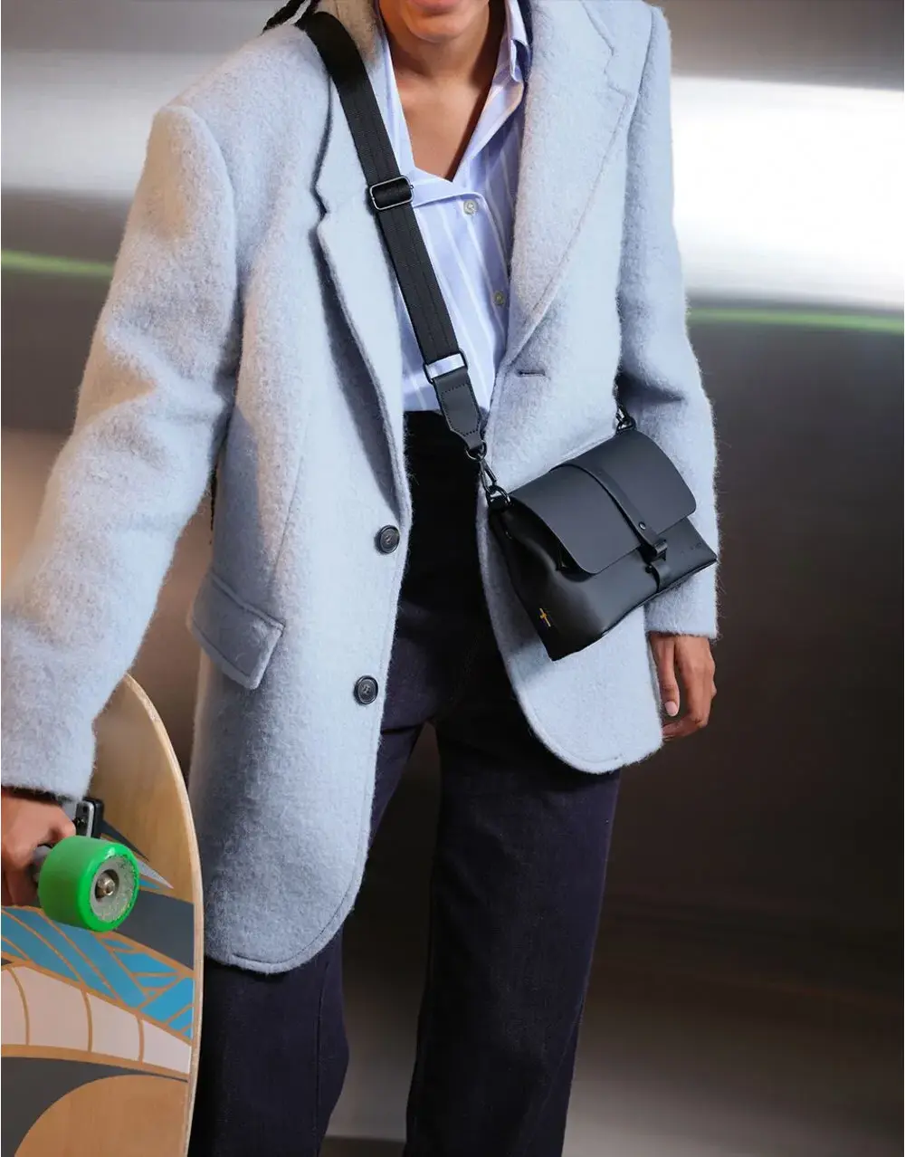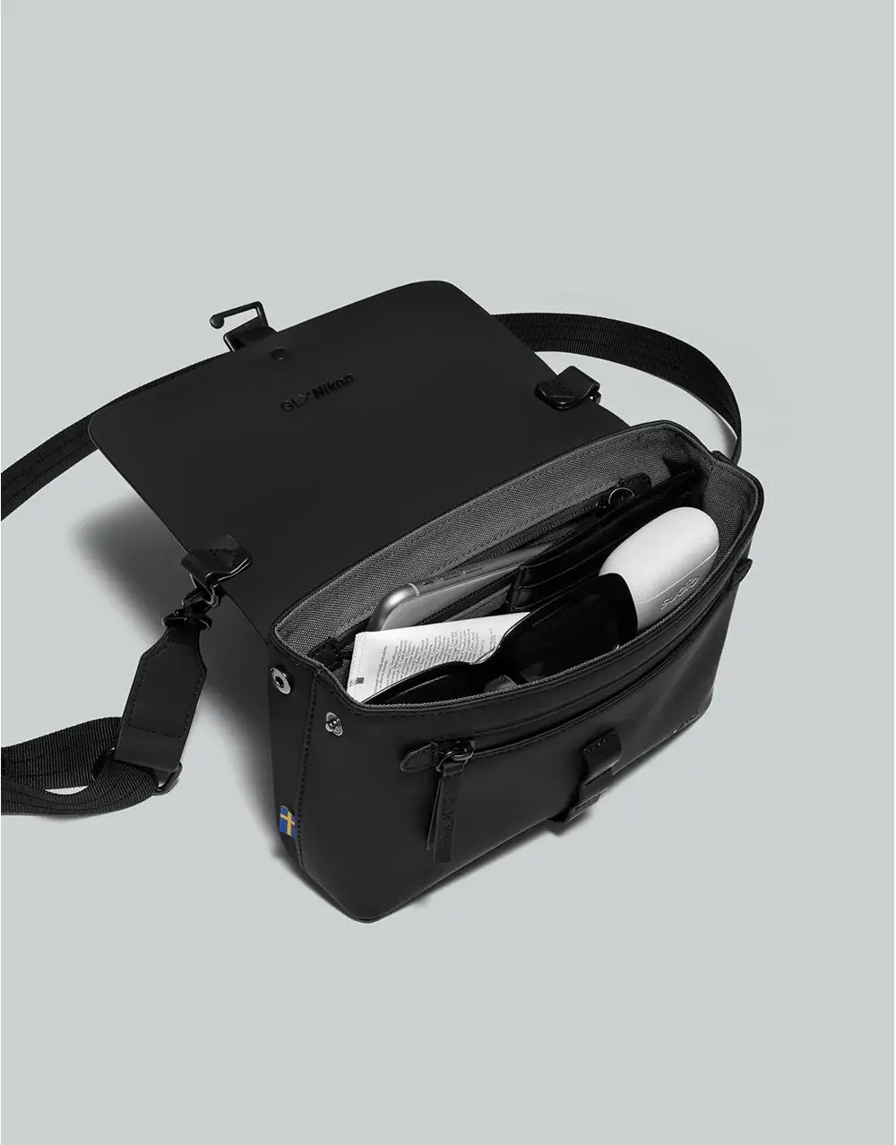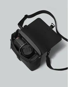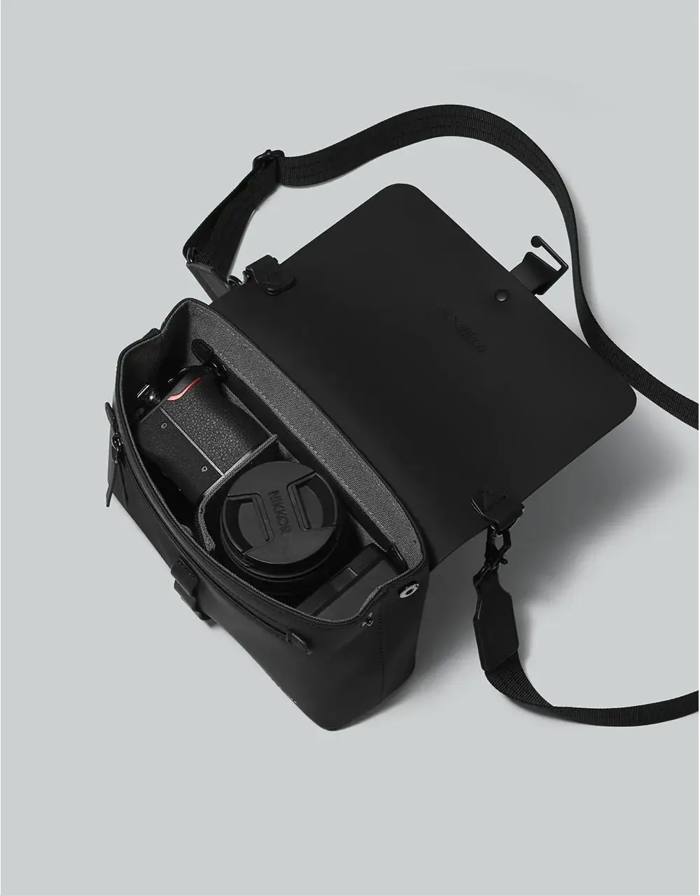Внешняя часть сумки Splash Crossbody изготовлена из экологически чистого водонепроницаемого материала премиум-класса, который легко чистить, а внутренняя отделка выполнена из темно-серой ткани. Перегородка на липучке позволяет разделить основное внутреннее пространство для размещения небольшой беззеркальной камеры Nikon с установленным объективом и дополнительного объектива.