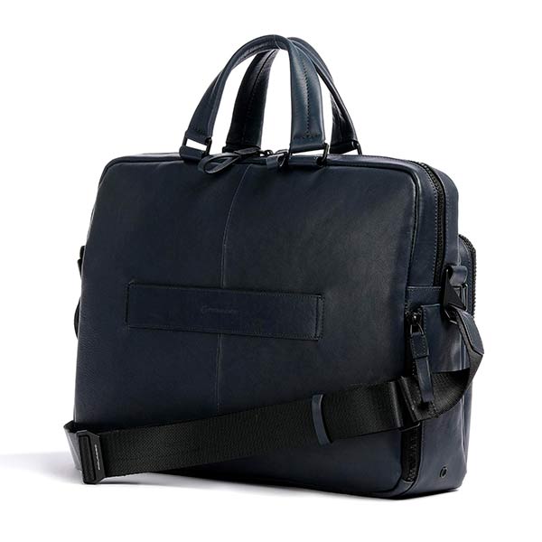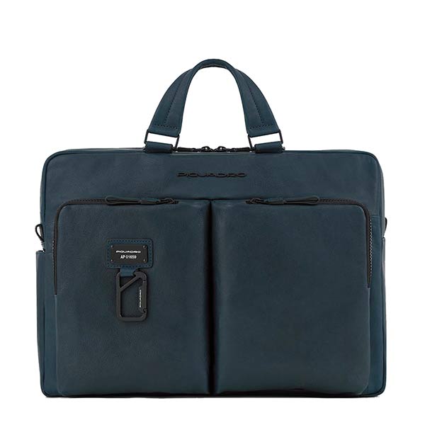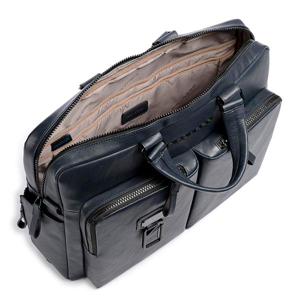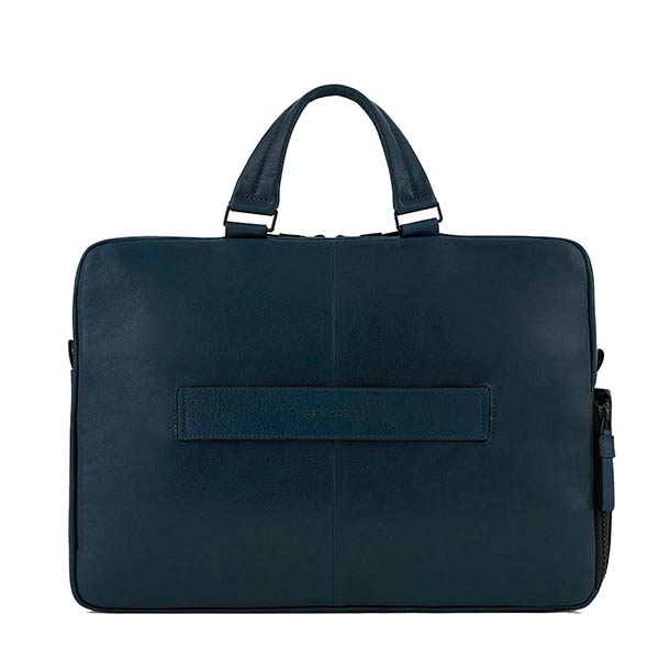 Деловая кожаная сумка из коллекции Piquadro Harper. Изготовлена из высококачественной телячьей кожи растительного дубления. Сумка имеет одно отделение с отсеком для 15.6 дюймового ноутбука, телефона, ручек и документов. На передней части расположены вместительные карманы на молнии, сбоку отсек для зонта/бутылки, на задней части крепление на ручку чемодана. Плечевой ремень в комплекте.