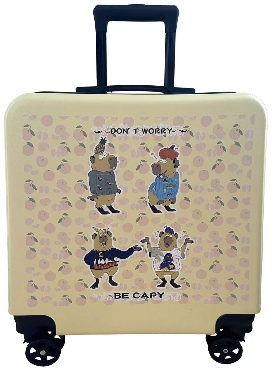 Современный пластиковый аксессуар премиум сегмента для ручной клади в самолет или багажник автомобиля. Отличается надежностью и удобством использования. Конструкция из облегченного пластика, улучшенная фурнитура, 4 маневренных колесика, удобная широкая ручка и милый трендовый принт с изображением забавных капибар в этот чемоданчик влюбляются и дети, и взрослые.