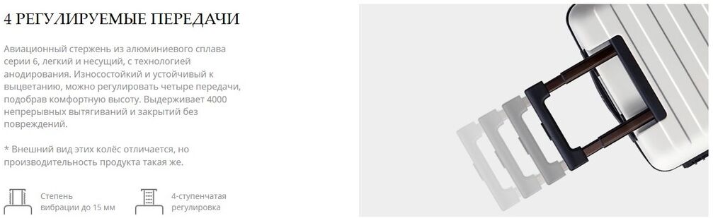 Чемодан Ninetygo Danube Luggage 20" синий имеет эргономичную выдвижную ручку с четырьмя уровнями регулировки высоты, что делает использование чемодана удобным для людей самого разного роста. Каркас ручки выполнен из утолщенного анодированного алюминия, имеет черное покрытие с характерным металлическим блеском, с повышенной износоустойчивостью и стойкостью к выцветанию. Утолщенные стенки каркасных труб обеспечивают их плотное прилегание друг другу, за счет чего уменьшается люфт, продлевается срок службы выдвижного механизма. Качество колес является одним из ключевых факторов, определяющих срок службы дорожного чемодана, а также напрямую влияет на удобство и уровень шума при передвижении. Колеса чемодана изготовлены из износостойкого и упругого TPE материала с выраженными амортизирующими и шумоподавляющими свойствами. Плотная фиксация деталей колеса также способствует снижению уровня шума. За счет шариковых подшипников колеса могут свободно вращаться под углом 360°, обеспечивая легкую маневренность чемодана. Не важно, идете ли вы по мягкой ковровой дорожке или грубому асфальту. Благодаря вместительному объему, вам не придется мучительно выбирать, какие же вещи взять с собой. Теперь, вместе с ним в одной руке и любимой книжкой в другой, а также с фотоаппаратом на шее и наушниками в ушах, вы сможете без проблем пройти в аэропорт. Не набирая в путешествие дополнительные сумки.