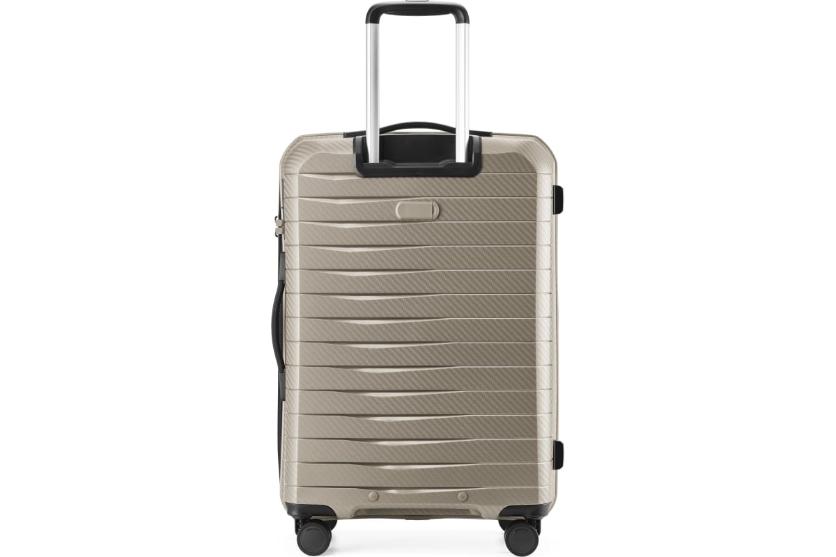 Чемодан имеет жесткую четырехуровневую телескопическую кнопочную ручку, которая надежно фиксируется на месте, обеспечивая максимальный контроль и комфорт.