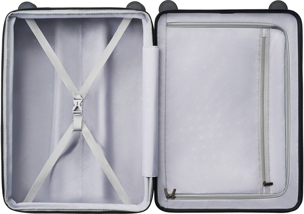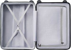 замок TSA; благодаря четырем колесам, боковым ручкам и выдвижной вертикальной ручке, вы сможете легко маневрировать и переносить чемодан; внутренние карманы, разделитель отделений и ремни помогут вам организовать свои вещи внутри чемодана
