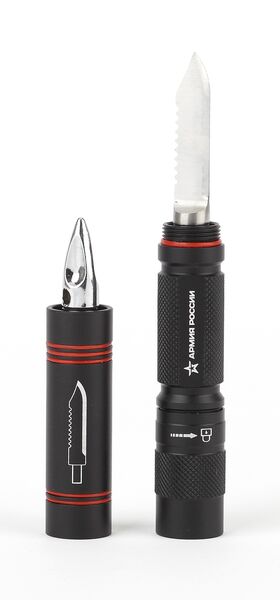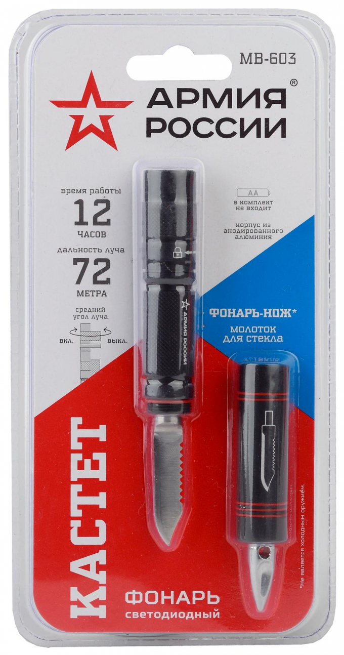 ЭРА Армия России Кастет - фонарь-нож и фонарь-молоток для стекла одновременно. Обладает световым лучом повышенной дальности - 72 метра. Работает от одной пальчиковой батарейки в течение 72 активных часов.Сверхъяркий и суперэкономичный LED-источник света не требует обслуживания и замены на протяжении всего срока службы фонаря. ЭРА Армия России Кастет выпускается в прочном металлическом корпусе с рифлными противоскользящими вставками. Длина ножа - 4,5 см. Двустороннее лезвие - острое и серрейторное (рифлное). Этот фонарь - настоящий трансформер: благодаря съмным откручивающимся ручкам, можно получить отдельно фонарь, нож и молоток для стекла. Лаконичная упаковка от дизайн центра ЭРА в стилистике бренда Армия России. Данный фонарь - часть серии, созданной совместно с АО "Военторг" (действующего на основе лицензии Министерства обороны РФ). Фирменный логотип Армия России с узнаваемой звездой расположен на корпусе изделия.