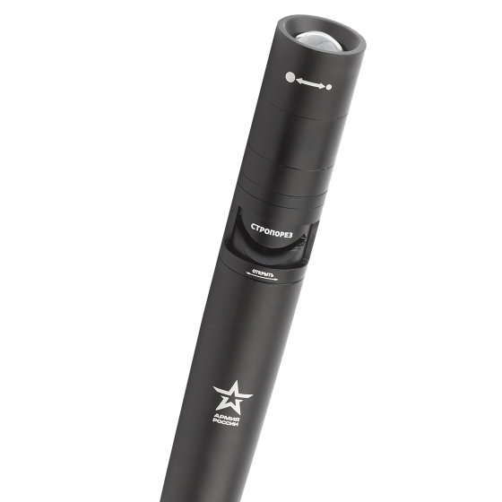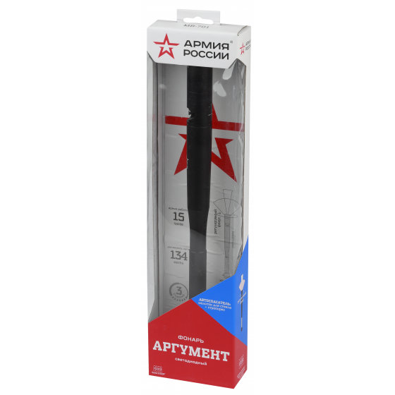 Особая конструкция и прочность корпуса позволяют применять ЭРА Армия России Аргумент для самозащиты. Фонарь упакован в картонную подарочную коробку в узнаваемой стилистике бренда "Армия России". Фирменная звезда "Армия России" - и на корпусе самого фонаря.