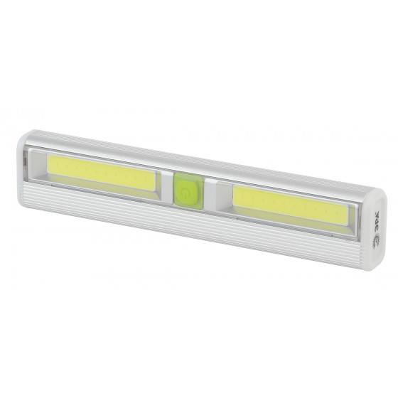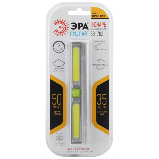 SB-702 - светодиодный фонарь-пушлайт с двумя режимами работы и несколькими типами креплений - самоклеющаяся основа, магнит, два отверстия для подвешивания на болты/гвозди. Прочный корпус из анодированного алюминия. Широкий угол светового пучка. Яркий заливающий свет, который не слепит глаза и не мерцает. Компактный фонарь-пушлайт легко крепится к любой гладкой поверхности и становится отличным решением для освещения пространств, где нет стационарного света, или для дополнительной подсветки затемнённых мест. ЭРА SB-702 размещают в подсобных помещениях, на отдалённых полках гардеробных, под кухонными шкафами. Он включается и отключается быстрым нажатием на кнопку, расположенную в центре корпуса. Повторное нажатие кнопки активирует эконом-режим с 30% яркости. Кнопка включения покрыта мягким прорезиненным материалом, препятствующим скольжению. Даёт широкое заливающее освещение при помощи двух светодиодных пластин СОВ (chip on board - мультикристал на плате), это промышленная технология, адаптированная для универсальных целей. Получился яркий, но при этом ровный мягкий свет, идеальный для бытовой подсветки. LED-платы не тускнеют со временем и не нуждаются в замене. Для того, чтобы закрепить фонарь в любом удобном месте, нужно просто отсоединить защитную плёнку и приклеить устройство с помощью прочной самоклеющейся основы. Одна минута - и вы обеспечены качественной подсветкой! На металлические поверхности ЭРА SB-702 крепится и вовсе за считанные секунды - в корпус встроен магнит. Устройство экономично - от одного комплекта батареек (3хААА) работает 50 активных часов.