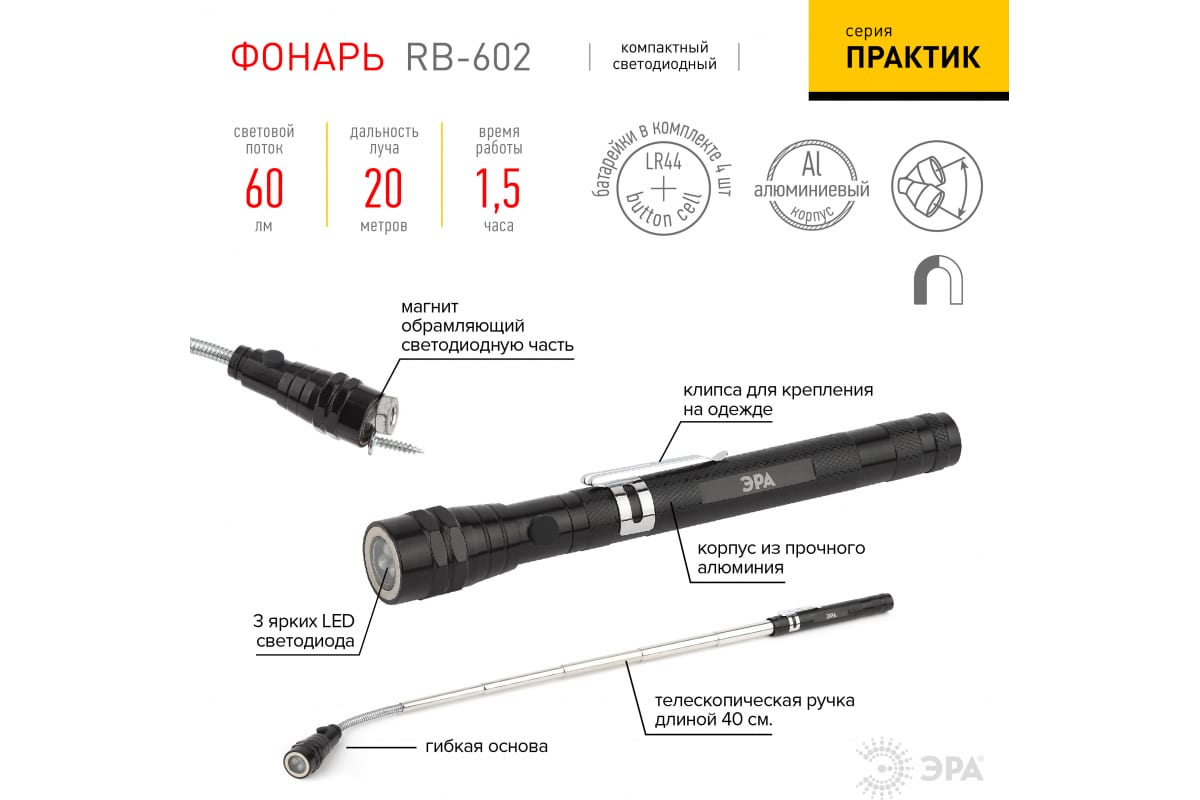 Технические характеристики ЭРА RB-602 Практик 3xLED, телескопическая ручка, магнит Б0033748