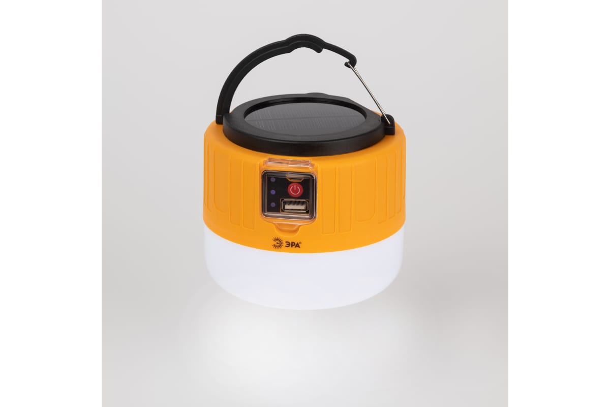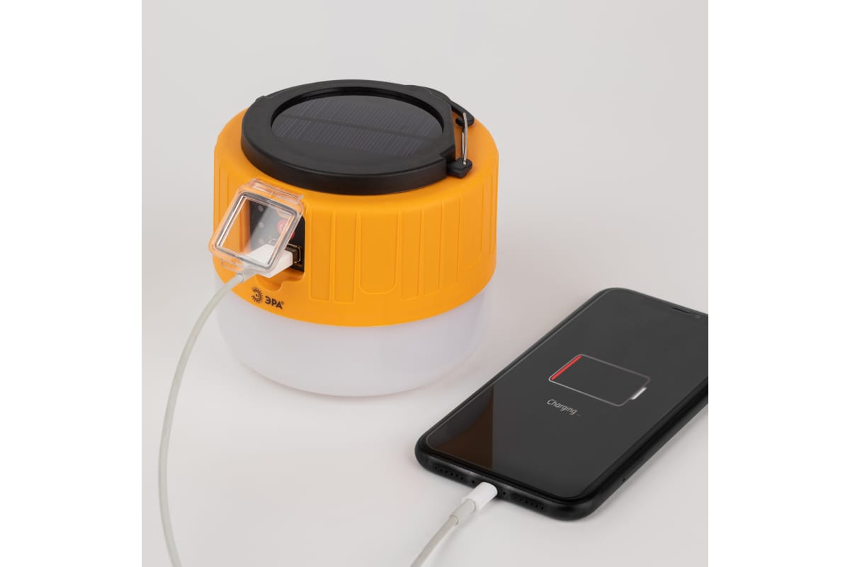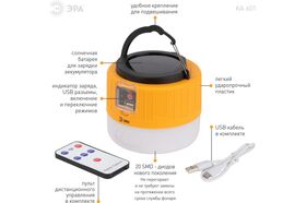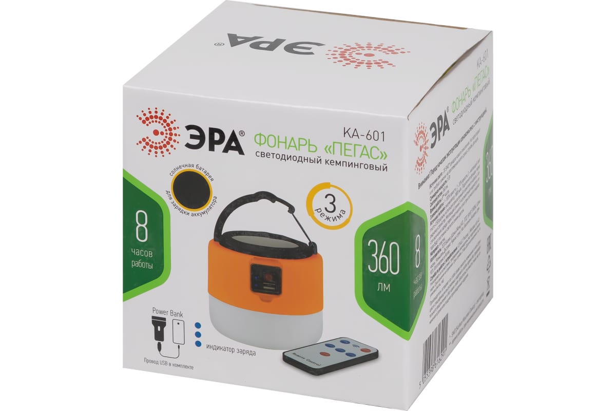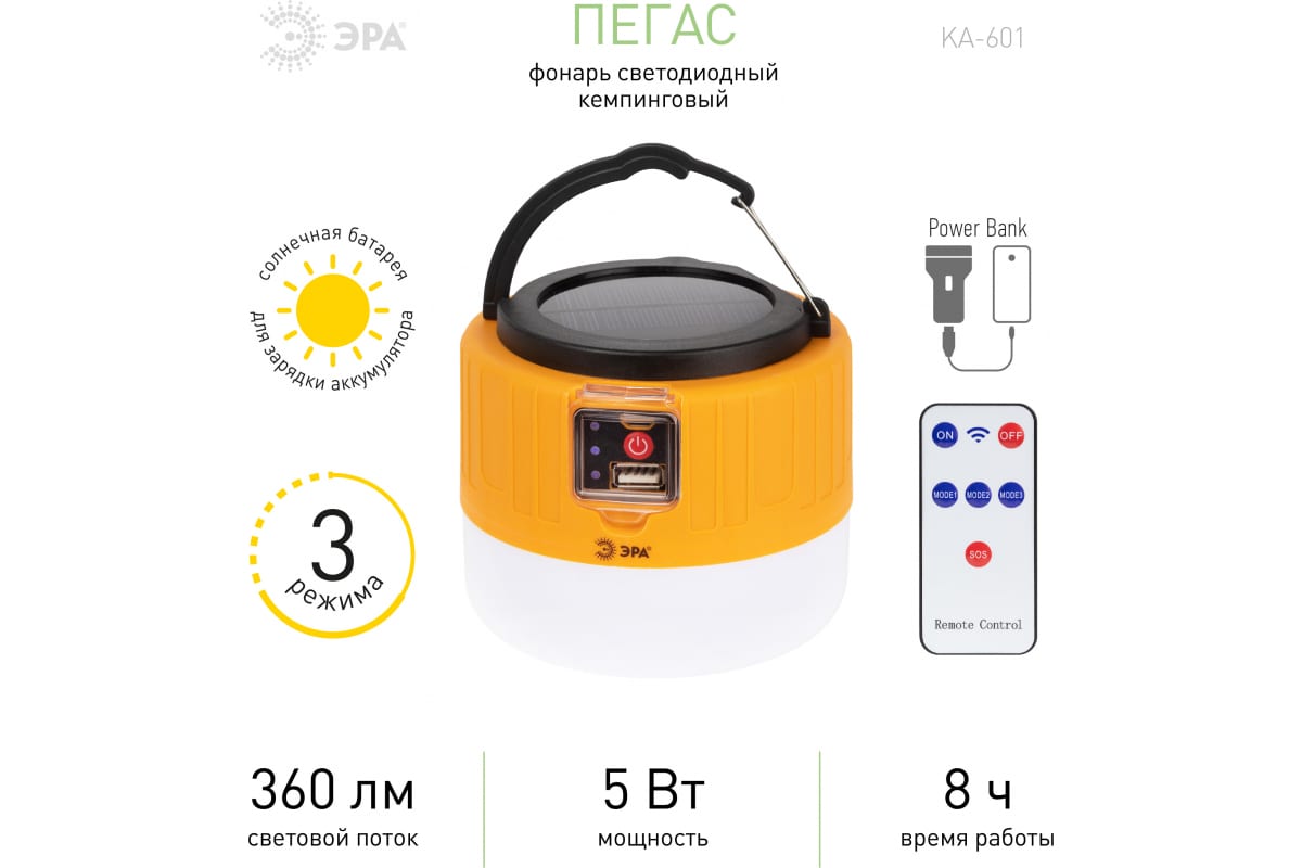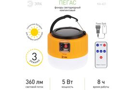 Аккумуляторный светодиодный кемпинговый фонарь ЭРА KA-601 Пегас на солнечной батарее пульт Б0054043 – инновационный кемпинговый фонарь со встроенной солнечной батареей и пультом дистанционного управления. Аккумуляторный фонарь ЭРА «Пегас» также заряжается от USB (кабель в комплекте). От одной зарядки непрерывно проработает 8 часов. Может использоваться в качестве powerbank – в условиях похода выручит, если нужно подзарядить телефон или другой мобильный гаджет. Мигающий 3-сегментный индикатор покажет уровень заряда аккумулятора. Разъёмы для зарядки фонаря и телефона, а также кнопка включения и управления режимами освещения, спрятаны в специальном отсеке под прозрачной пластиковой крышкой.