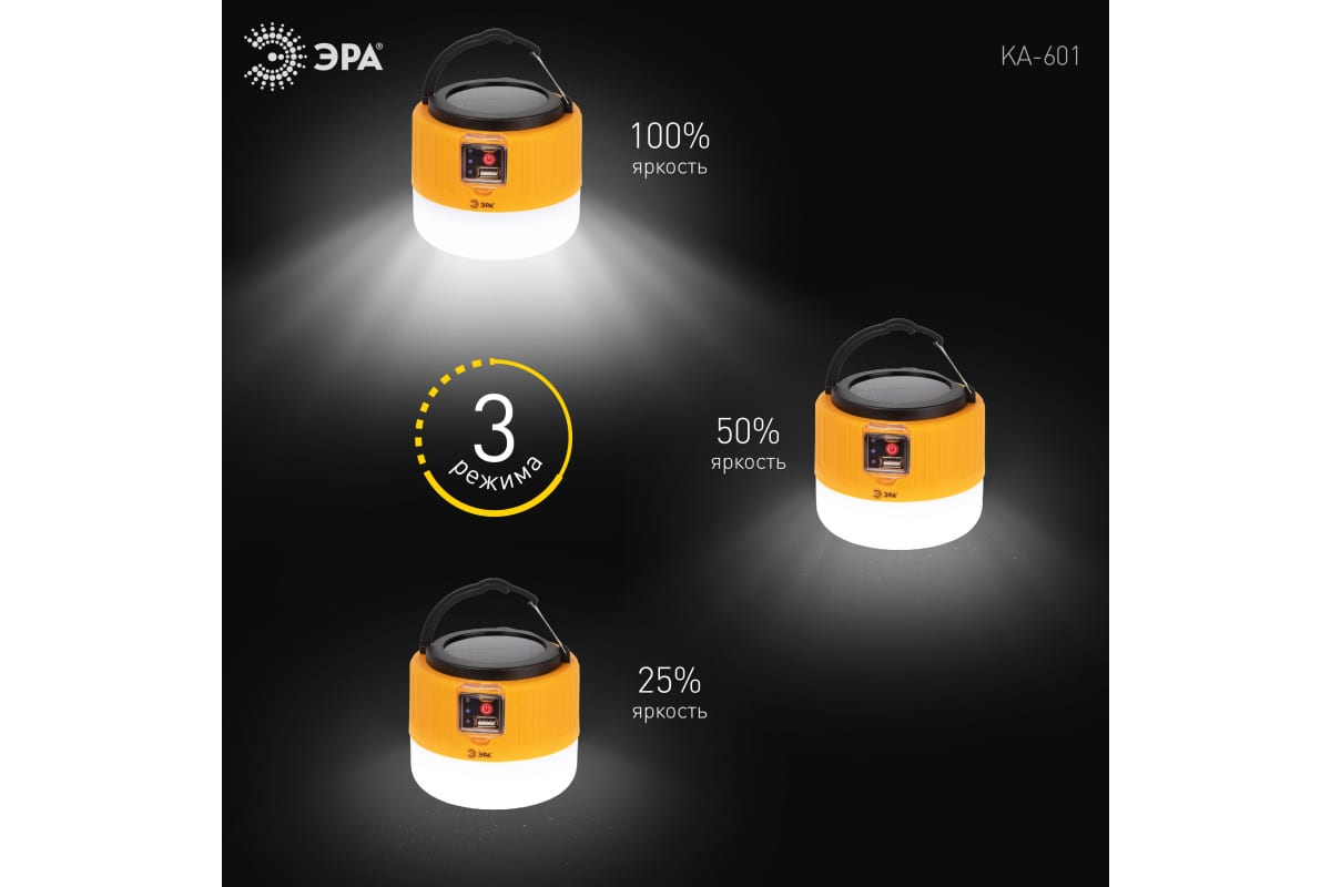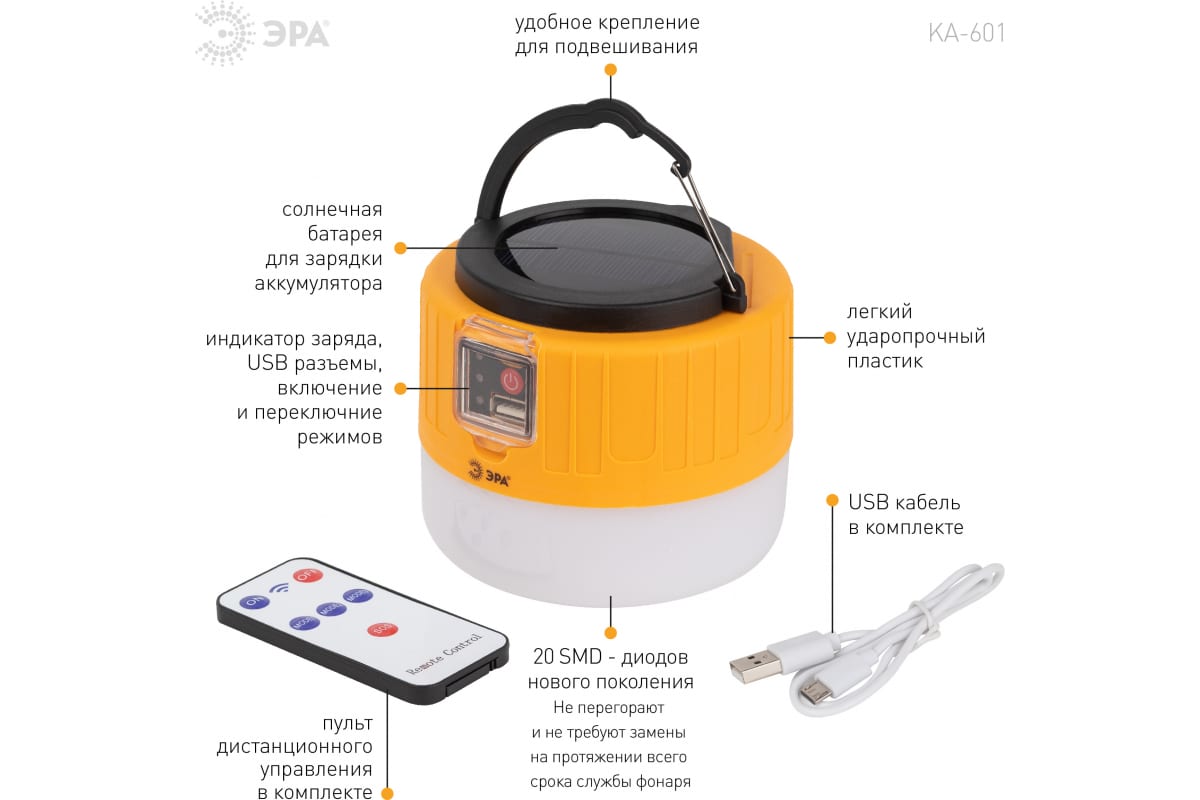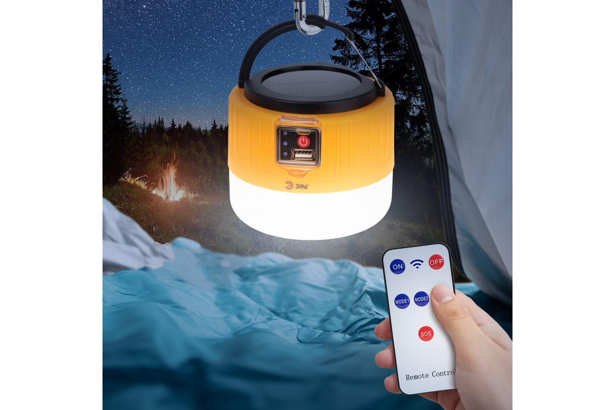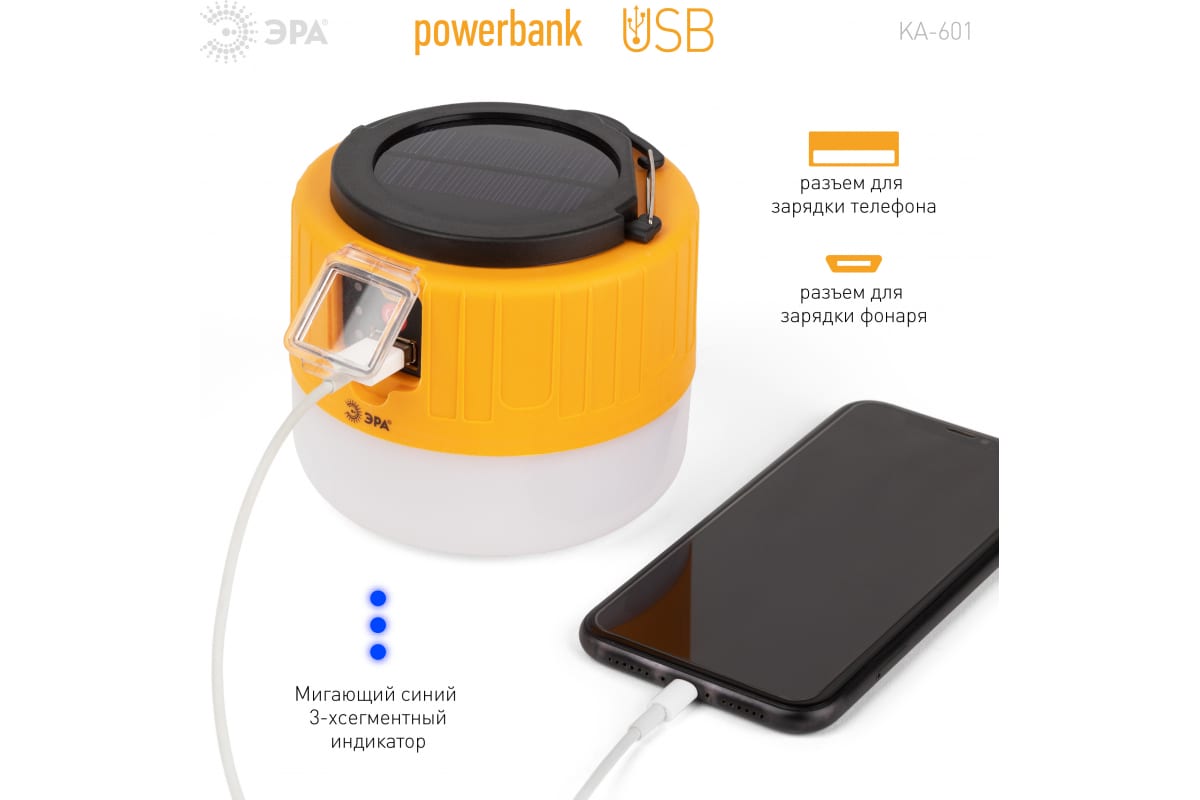 Аккумуляторный светодиодный кемпинговый фонарь ЭРА KA-601 Пегас на солнечной батарее пульт Б0054043 – инновационный кемпинговый фонарь со встроенной солнечной батареей и пультом дистанционного управления. Аккумуляторный фонарь ЭРА «Пегас» также заряжается от USB (кабель в комплекте). От одной зарядки непрерывно проработает 8 часов. Может использоваться в качестве powerbank – в условиях похода выручит, если нужно подзарядить телефон или другой мобильный гаджет. Мигающий 3-сегментный индикатор покажет уровень заряда аккумулятора. Разъёмы для зарядки фонаря и телефона, а также кнопка включения и управления режимами освещения, спрятаны в специальном отсеке под прозрачной пластиковой крышкой.